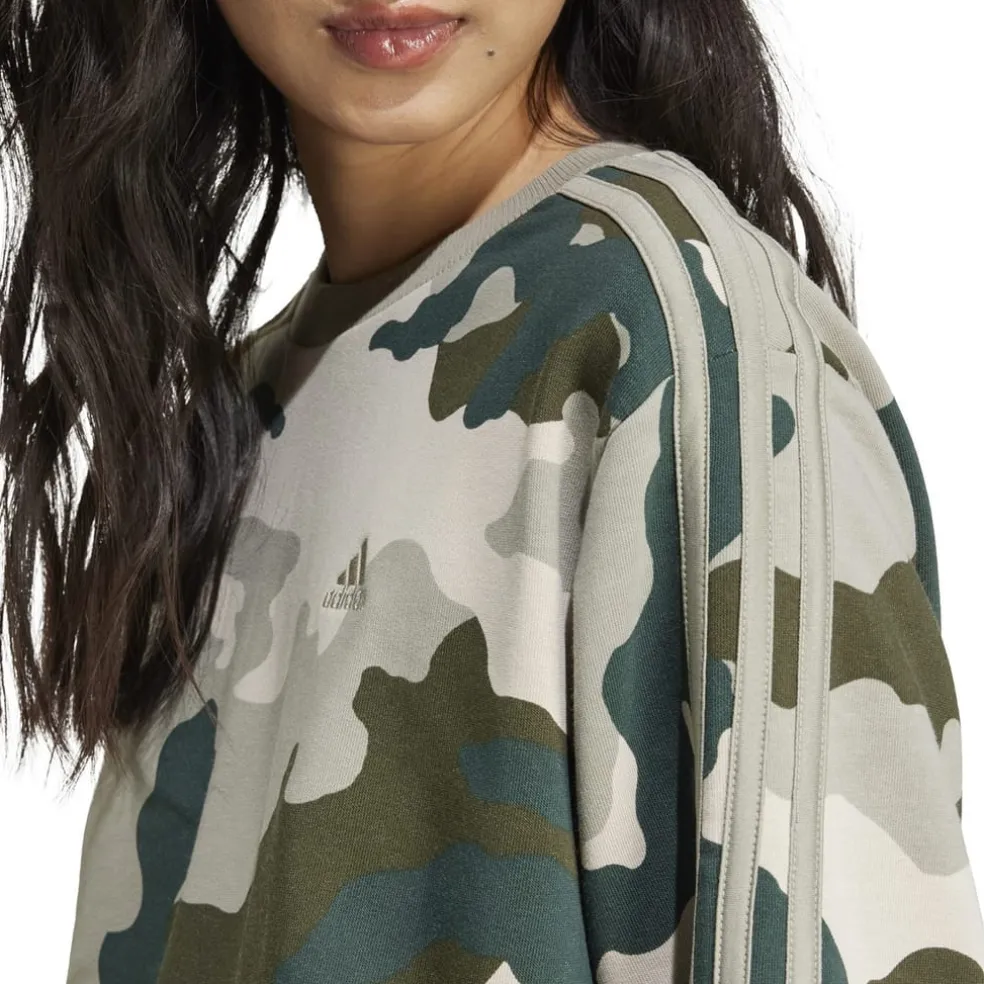 adidas Essentials 3 Stripes Camo Print Cropped Sweatshirt in Green