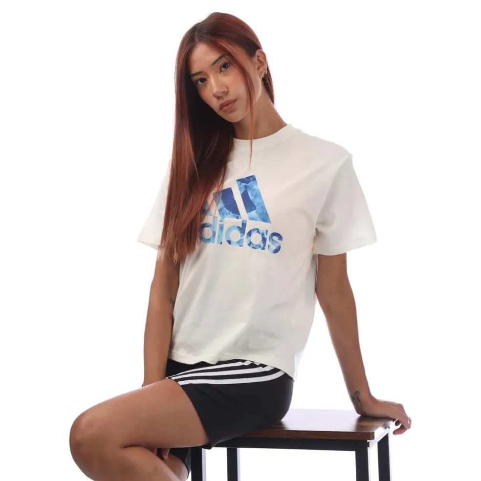 “This floral graphic tee from adidas is your invitation to a joyful summer. Soft cotton and a roomy shape come together for comfort that will carry you from sunup to sundown. Whether wandering weekend markets or catching up over coffee, the bright flower print and bold adidas Badge of Sport logo are an easy way to brighten your day and spread smiles. The cotton in this product has been sourced through Better Cotton. Better Cotton is sourced via a chain of custody model called mass balance. This means that Better Cotton is not physically traceable to end products.Find out more here: https://bettercotton.org/who-we-are/our-logo/”A cotton t-shirt with bold adidas style.Ribbed crewneckLarge graphic infill adidas Badge of Sport printRegular fit100% cotton
