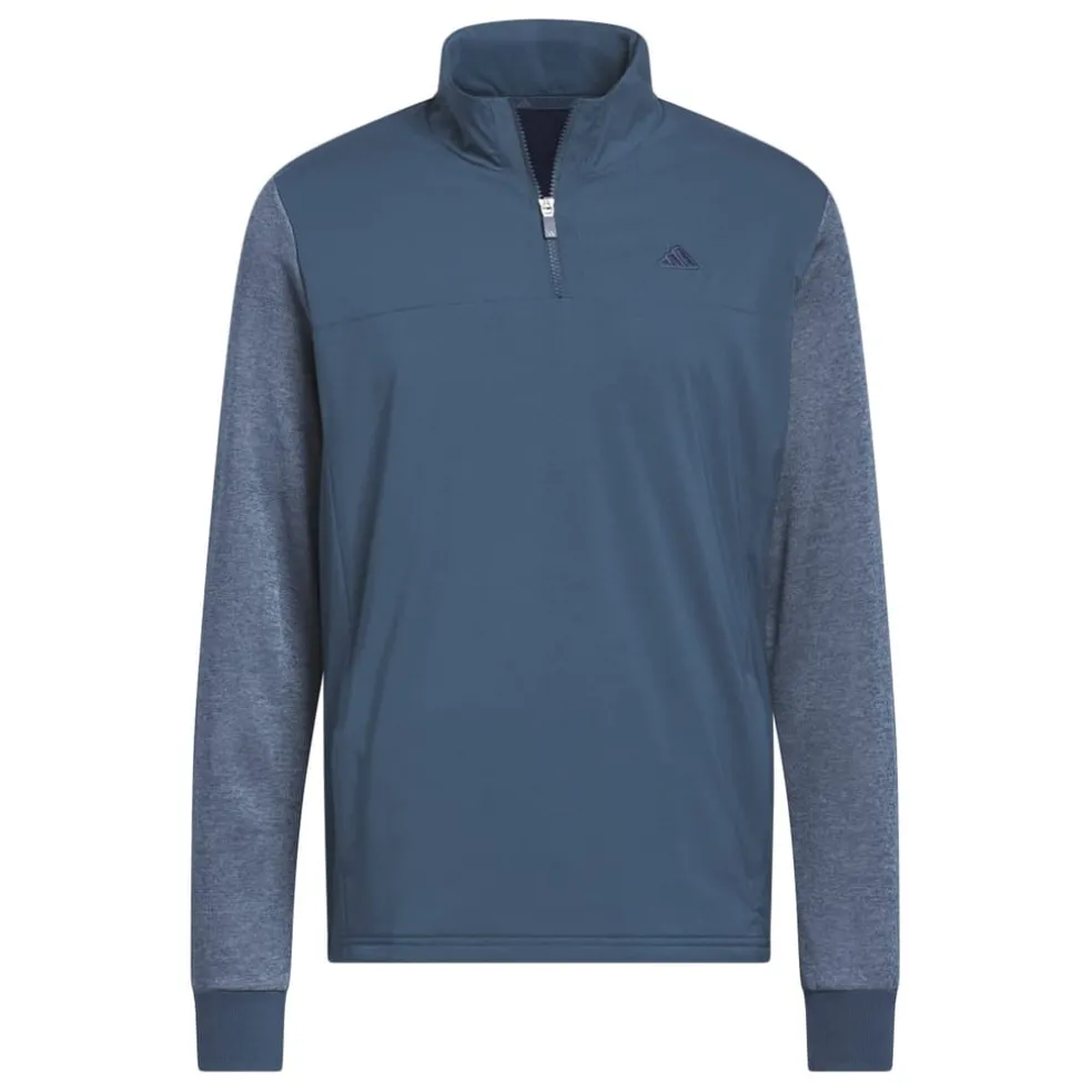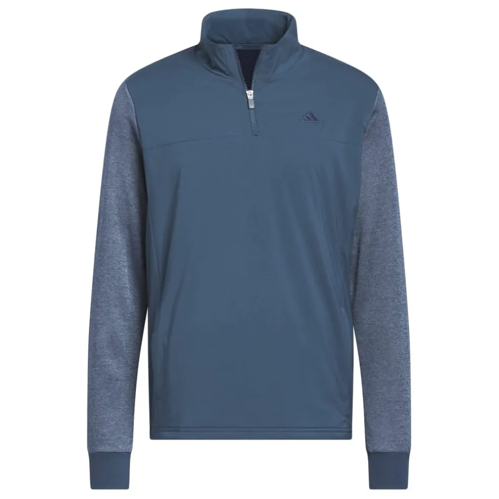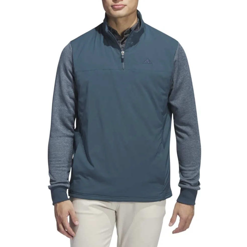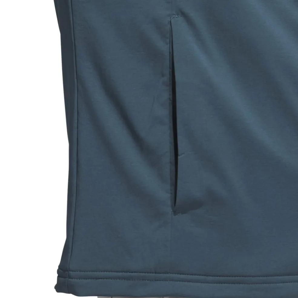 Staying comfortable during cold-weather rounds is all about layers. Pull on this quarter-zip adidas golf jacket to stay warm from the first hole to the last. A water-repellent finish shrugs off moisture, while ribbed cuffs and a stand-up collar seal out the chill. Soft fleece on the arms lets you move freely through your swing. Made with a series of recycled materials, and at least 70% recycled content.