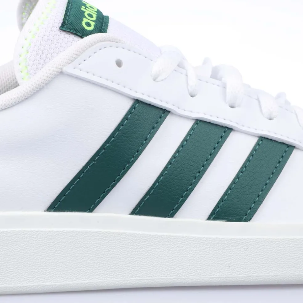 “It’s time to build — or fill in the gaps — in your retro sneaker collection. Let’s start with these Grand Court shoes. The designers have revisited every element, adding a sturdy cupsole that offers grip in the wettest weather. Of course, these shoes stay true to their adidas roots too. The smooth, synthetic leather upper lets everyone know you’re Team 3-Stripes.Made with a series of recycled materials, this upper features at least 50% recycled content.”Revamped classic sneakers made in part with recycled materials.Synthetic leather upperLace closureRegular fitSynthetic liningRubber cupsole