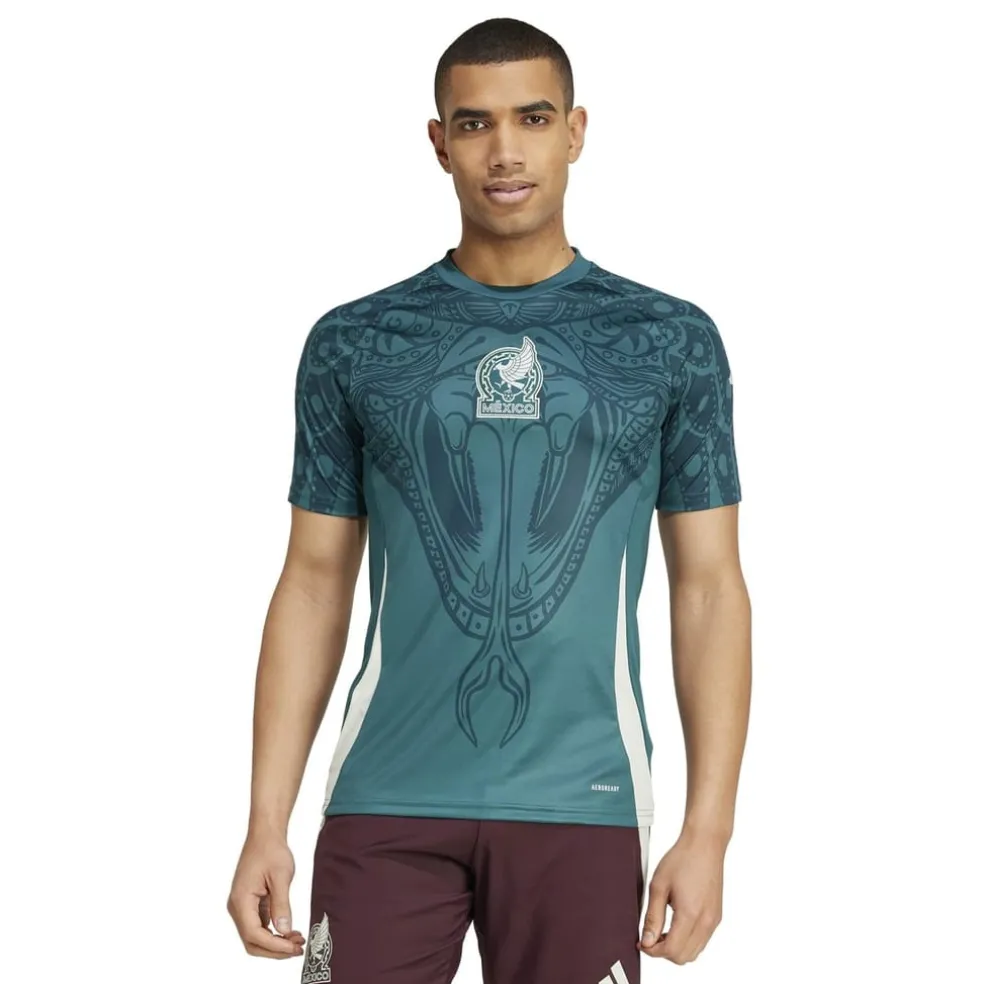 – Designed in striking green, adorned with eagle feathers on the shoulders and a powerful snake’s head on the chest, this shirt pays homage to Mexico’s rich heritage and fierce spirit. The iconic adidas 3 bar logo on the right sleeve adds an authentic touch, while the Mexico embroidered crest front and centre amplifies the sense of pride and belonging. Whether you are warming up or cheering on your favourite team, the adidas Mexico Pre Match Shirt 2024 represents the heart and soul of Mexica