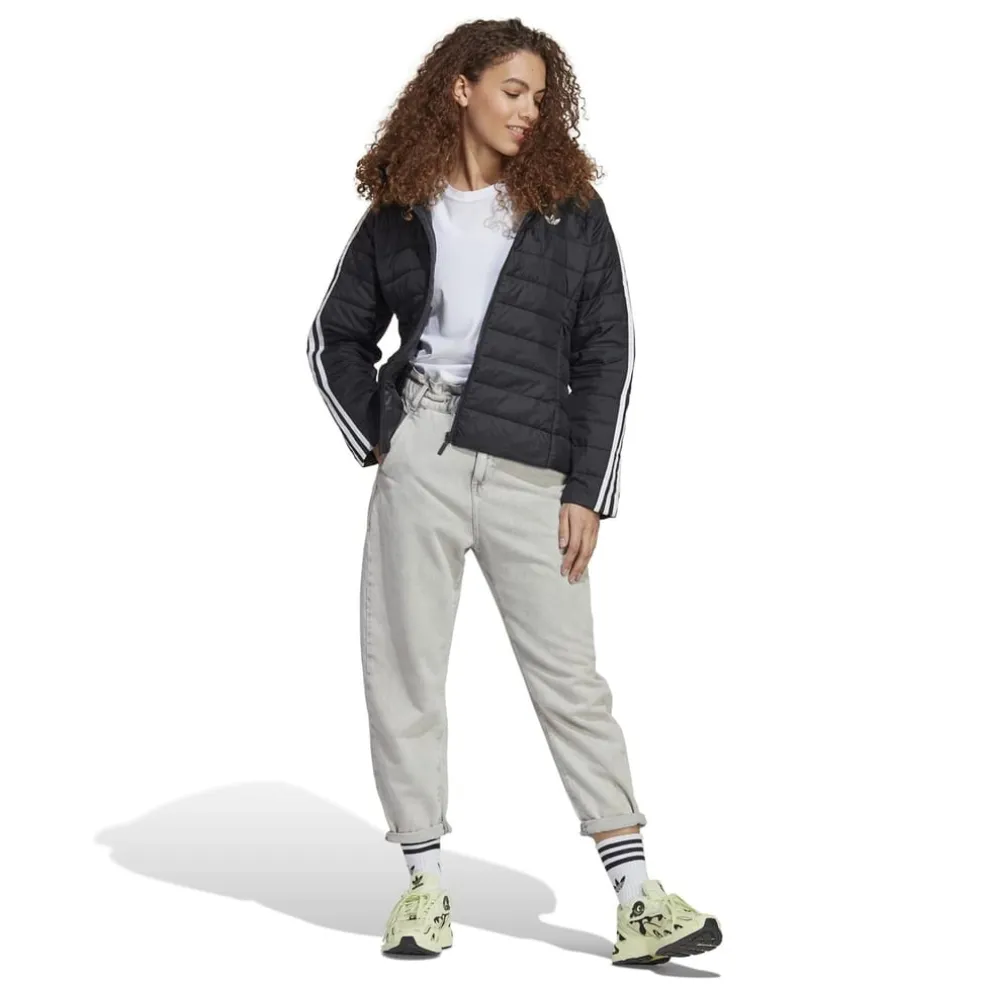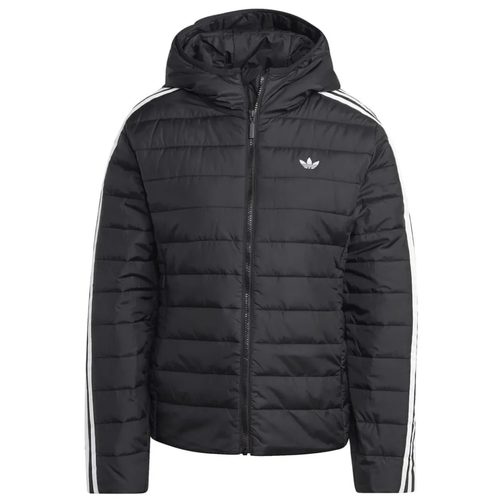 The adidas Originals puffer jacket offers a sleek slim fit, perfect for those seeking style and comfort. This short-length puffer jacket features a solid pattern with a hooded neckline and convenient zipper closure. Embellished with a logo and side stripes, it combines classic design with modern details, making it an ideal choice for cooler weather.