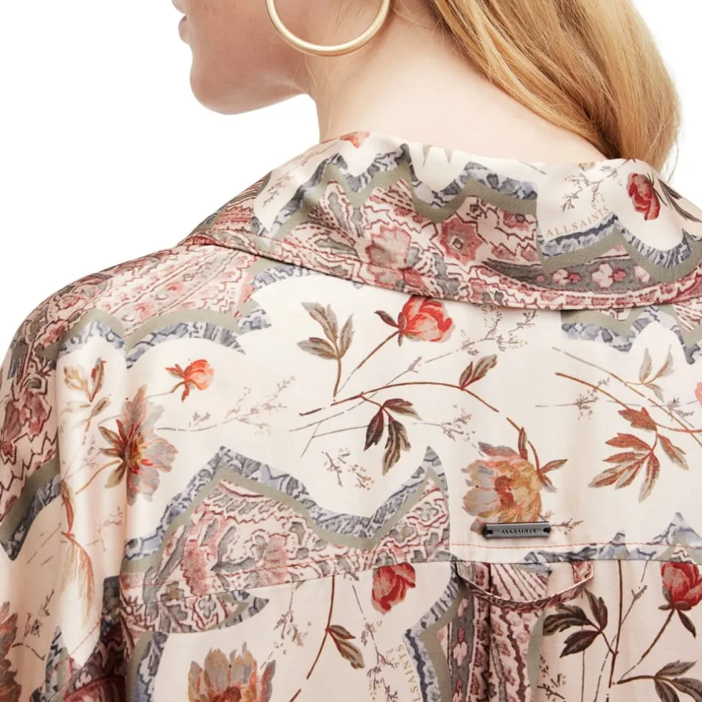Introducing the AllSaints shirt from the Barbie collection, a relaxed fit dress shirt featuring a delicate floral pattern. This long sleeve top is designed with a classic shirt collar and button closure, perfect for both casual and smart occasions.
