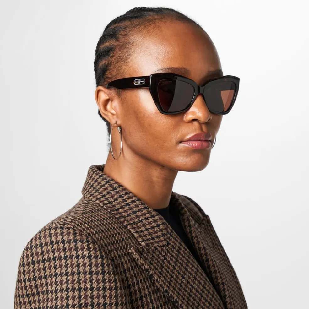Add a chic touch to your sunnies collection this summer with these Balenciaga Havana sunglasses. Straight from the SS23 collection this stylish pair have been adroitly crafted from recycled acetate, for a sustainable addition to your sun wear collection.Designed in a large cat eye frame for a sultry touch, especially with the tortoiseshell pattern for a timeless appeal. Embellished with the signature B logo for instant brand recognition. Size M56mm-19mm-140mm. Comes in the Balenciaga glasses case for protection.