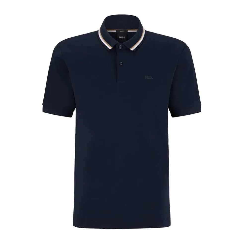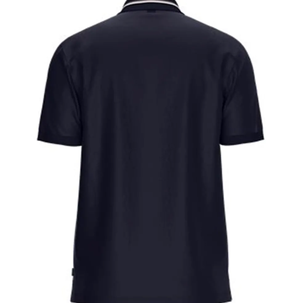 – For a polished and upscale look, the striped trim to the polo collar complements the overall aesthetic.