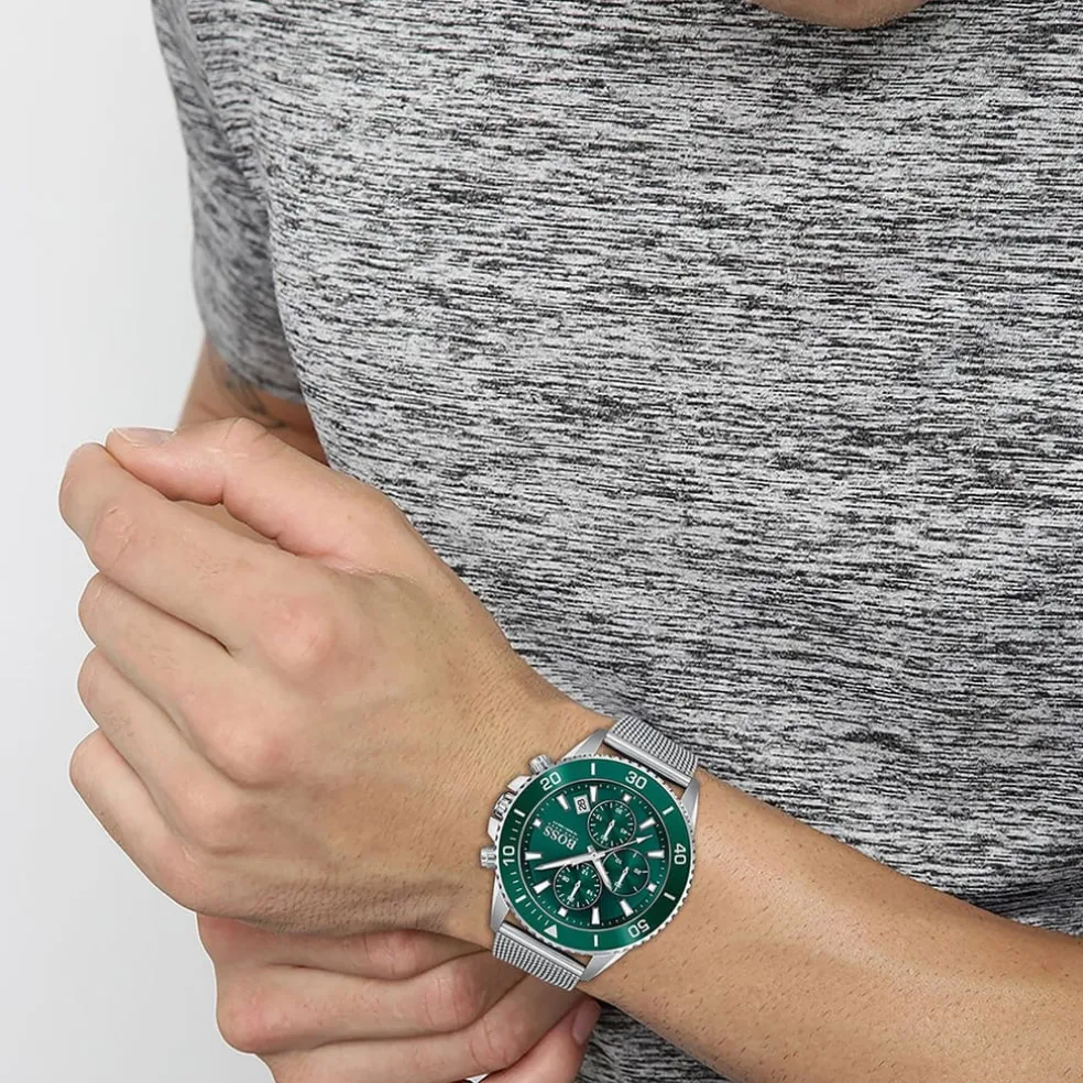 Boss Admiral Stainless Steel Green Dial Mesh Strap Watch in Silver