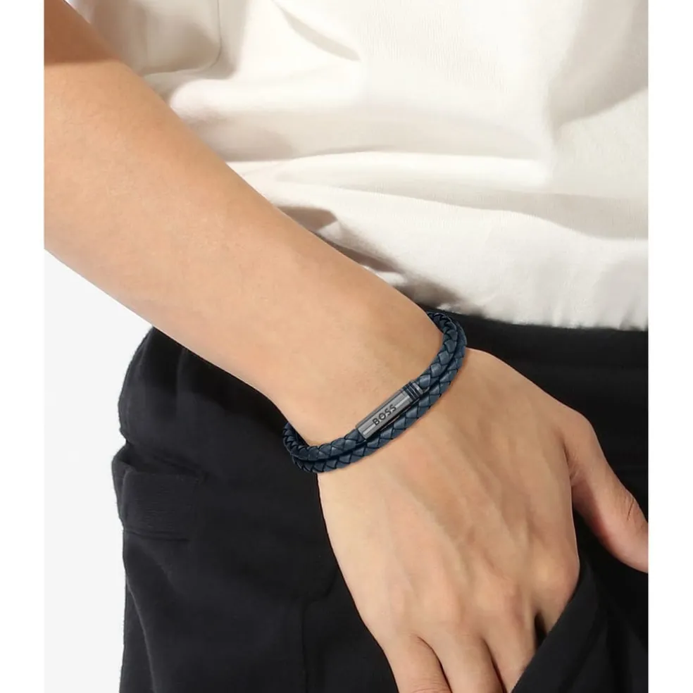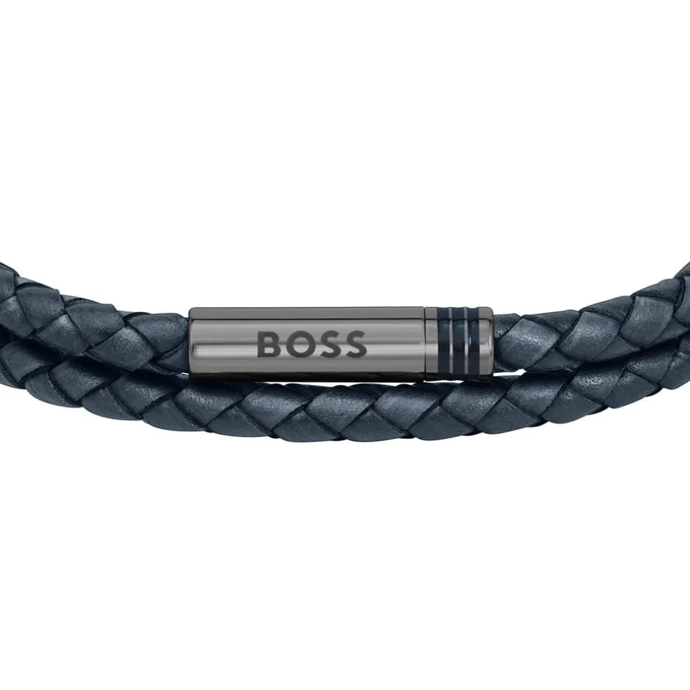 BOSS gents double wrap leather bracelet from the Ares collection. Features braided design with stainless steel magnetic closure. Length 190mm. Available in Black and Blue Leather