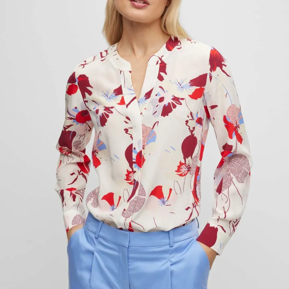 A modern regular-fit blouse in floral-print silk with a notch neckline and concealed closure by BOSS Womenswear.