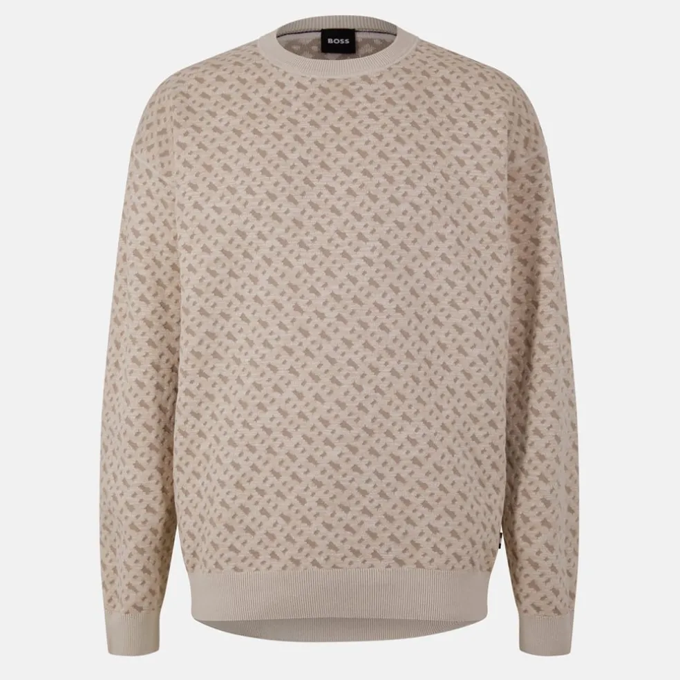 This Boss top features a geometric pattern and is crafted from a knit material. It has a crew neck and long sleeves with ribbed cuffs, offering a regular fit. The design is completed with a subtle logo embellishment, adding a touch of brand identity.