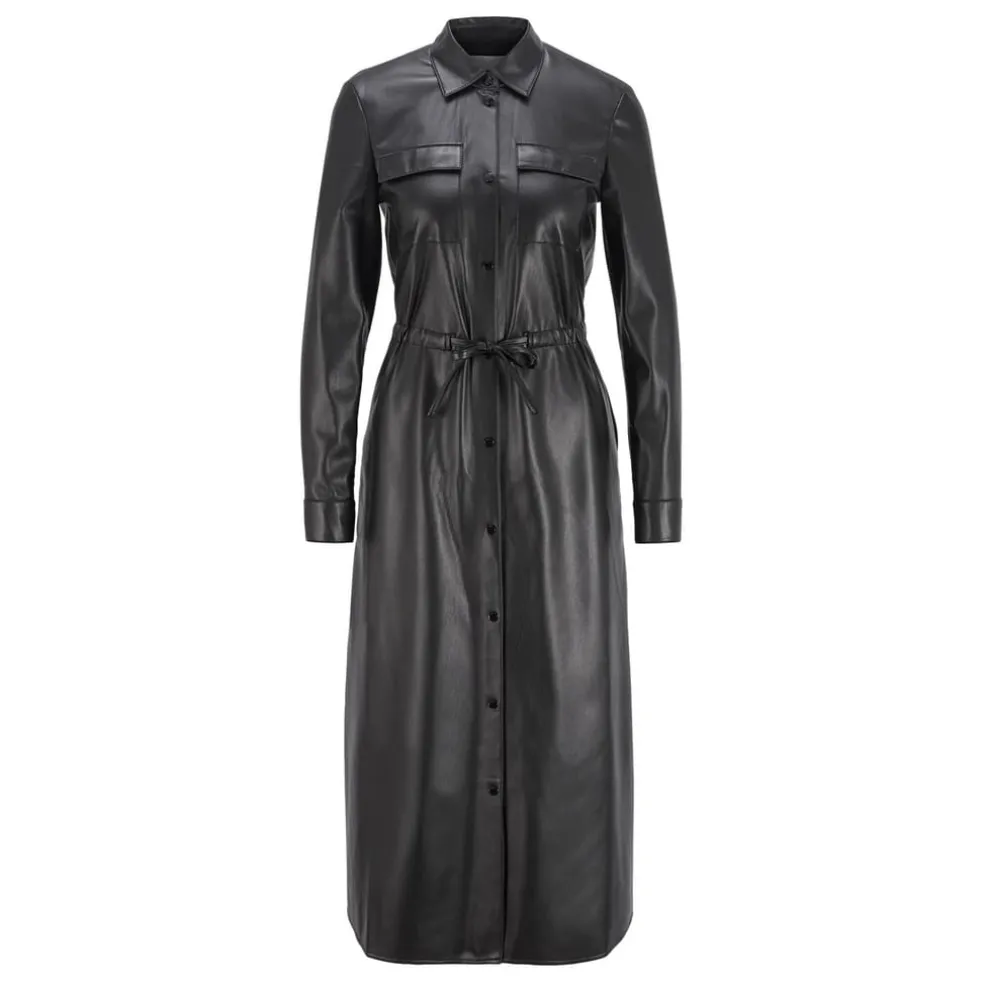 A statement dress crafted in faux leather by BOSS Womenswear. This shirt dress features long sleeves, patched pockets and a drawstring at the waist for a defined silhouette. Create a chic business look with this modern design.