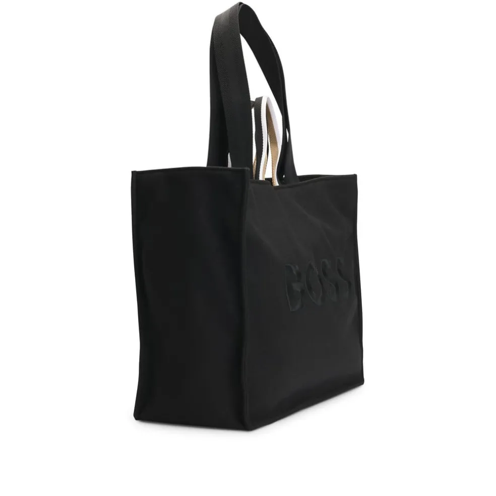 An open-top tote bag with signature-stripe handles by BOSS. This modern accessory is crafted in wool-effect fabric with large logo embroidery.