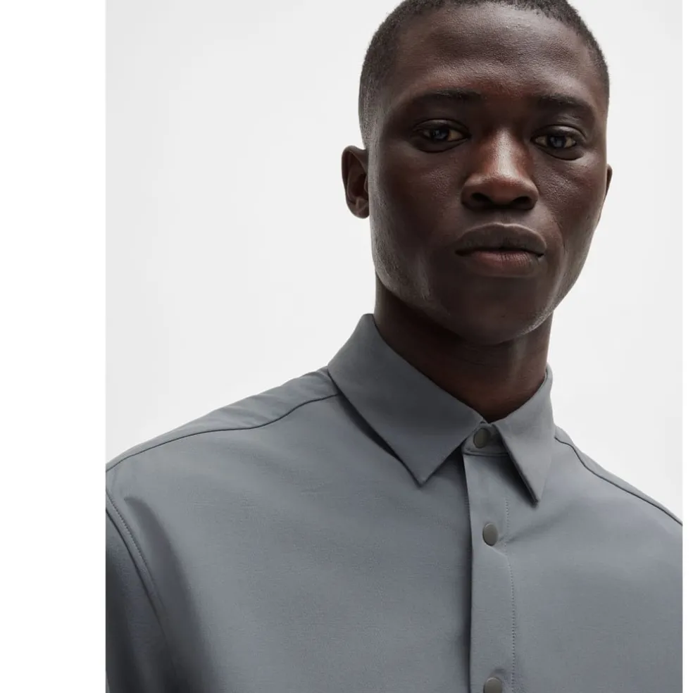 A water-repellent overshirt in stretch material by BOSS. This relaxed-fit piece has a seamless branded pocket on the sleeve.