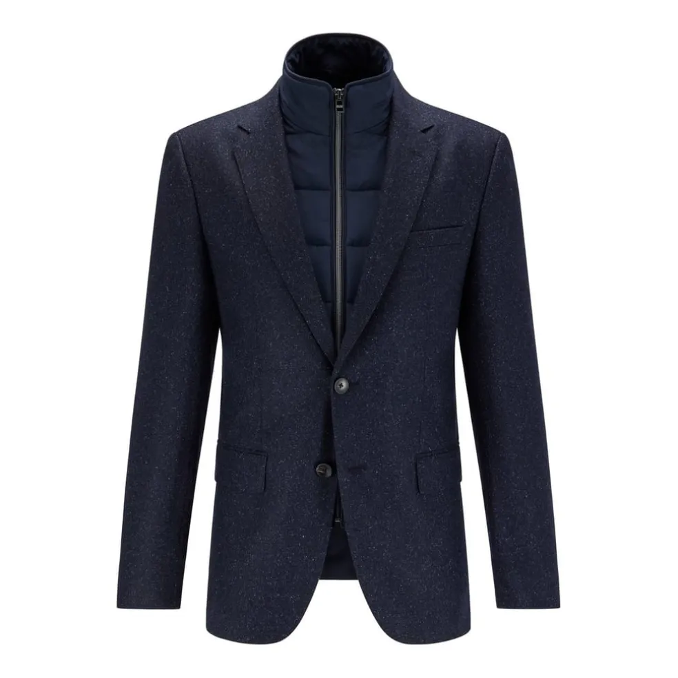 Men’s Boss H-Hutson Blazer Jacket. An innovative jacket offered in a streamlined fit, by BOSS Menswear. Crafted in modern tweed made from yarns rich in virgin wool with a hint of silk, this single-breasted blazer features a detachable inner bib with a zip and lightweight padding. Flap pockets, notch lapels and a two-button closure add authentic finishing touches. Material: 62% Virgin Wool, 18% Polyamide, 10% Silk, 8% Polyester, 2% Elastane.