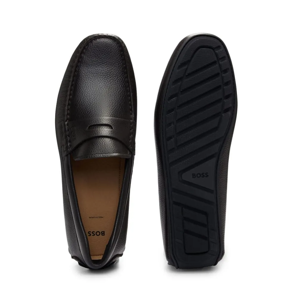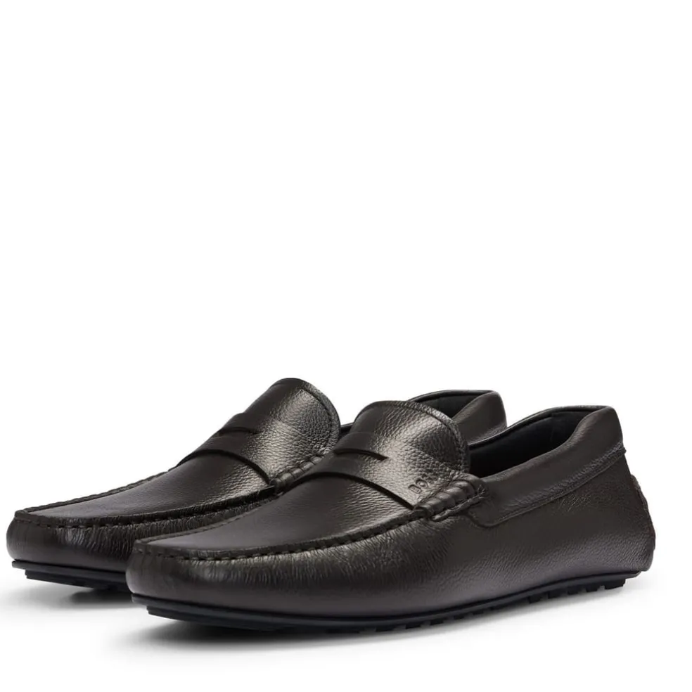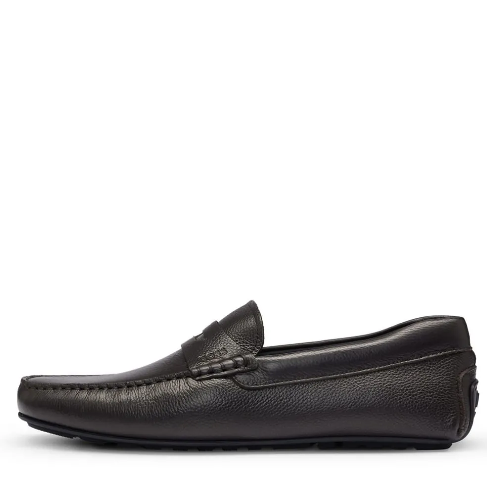 Premium driver moccasins made in Portugal by BOSS. Featuring a full rubberised sole, this pair is crafted in grained leather with a debossed logo strap.