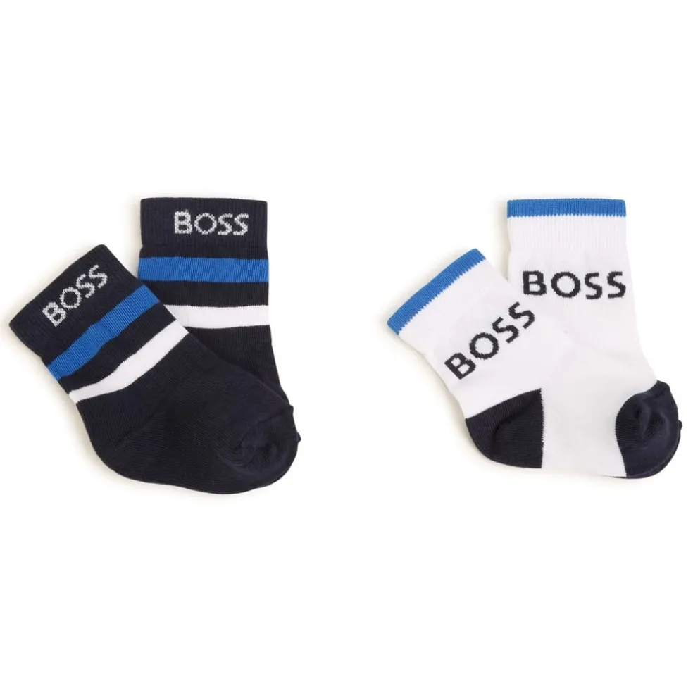 – This set includes two pairs of socks, each exquisitely made from a comfortable cotton blend that provides a super soft feel for long-lasting comfort. The stretch fabric stripes provide a snug fit and ensure maximum comfort throughout the day while adding a touch of contemporary flair. Adding to their charm, the socks feature a stripe detail that effortlessly elevates any outfit, giving a subtle yet stylish accent to little ones’ look. To complete the design, the socks are adorned with the iconic Boss logo to proudly showcase the brand’s rich heritage and commitment to quality. Composition: 75% Cotton, 16% Polyester, 4% Polyamide, 3% Elastane, 2% Elastodiene. Machine washable, follow care instructions.