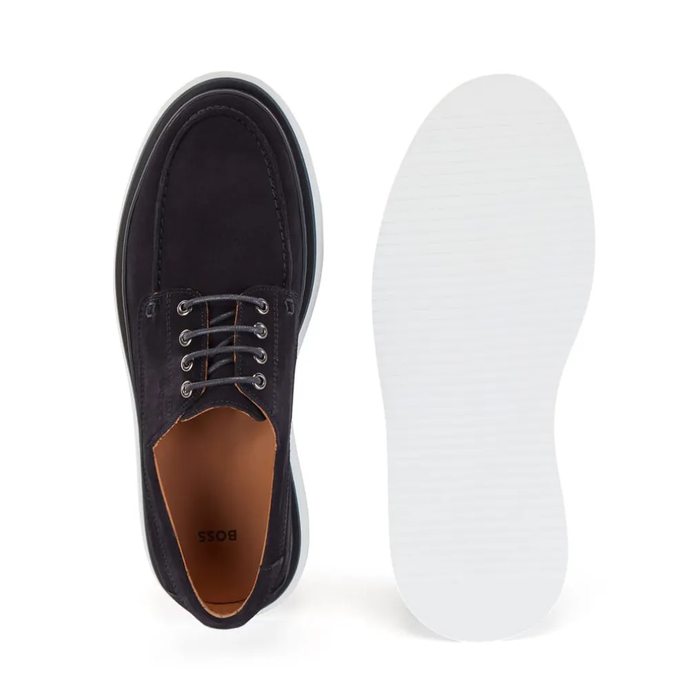 Made in Portugal. New Casual BOSS item. Full suede upper design enriched by stitched apron toe detail on the vamp and logo detail on the side. Backtab features the iconic tape.. Full EVA sole offers comfort and lightweight.