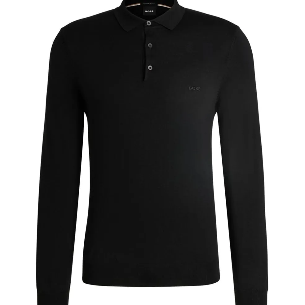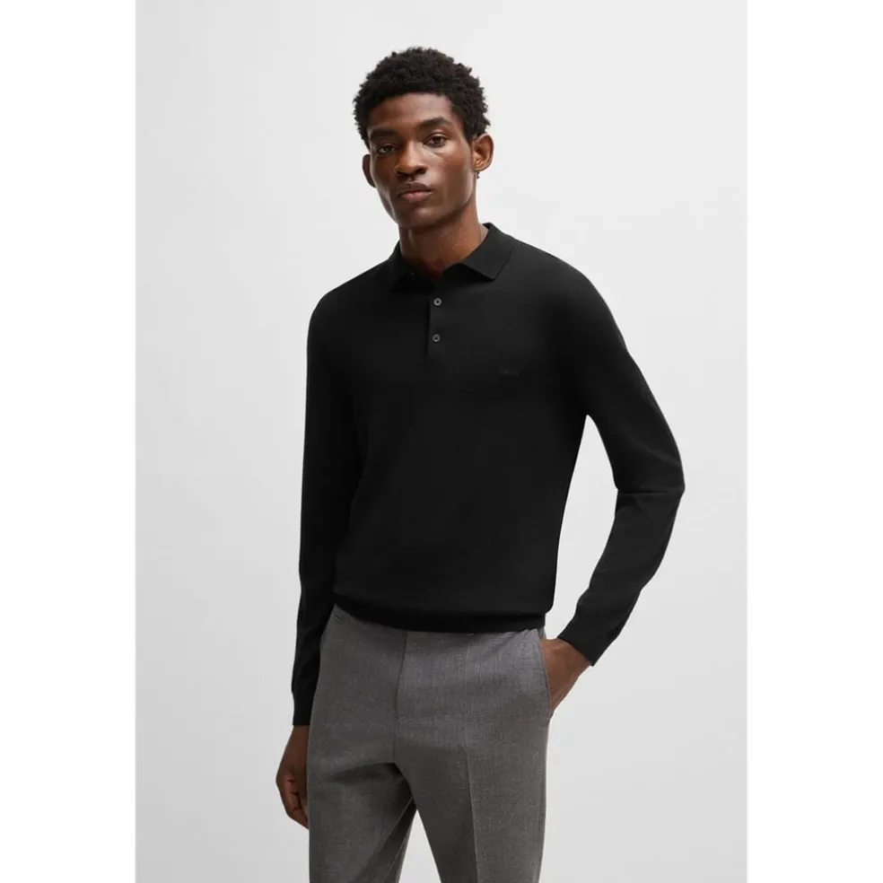 Introducing the Boss sweater, a timeless addition to your wardrobe. This long sleeve polo shirt style sweater features a classic polo collar and button closure, offering a regular fit for versatile wear. The ribbed cuffs add a subtle touch of detail, making it a stylish choice for any occasion.