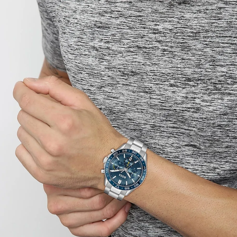 – A 43mm stainless steel case, blue dial, stainless steel bracelet. Water resistant to 5 ATM.