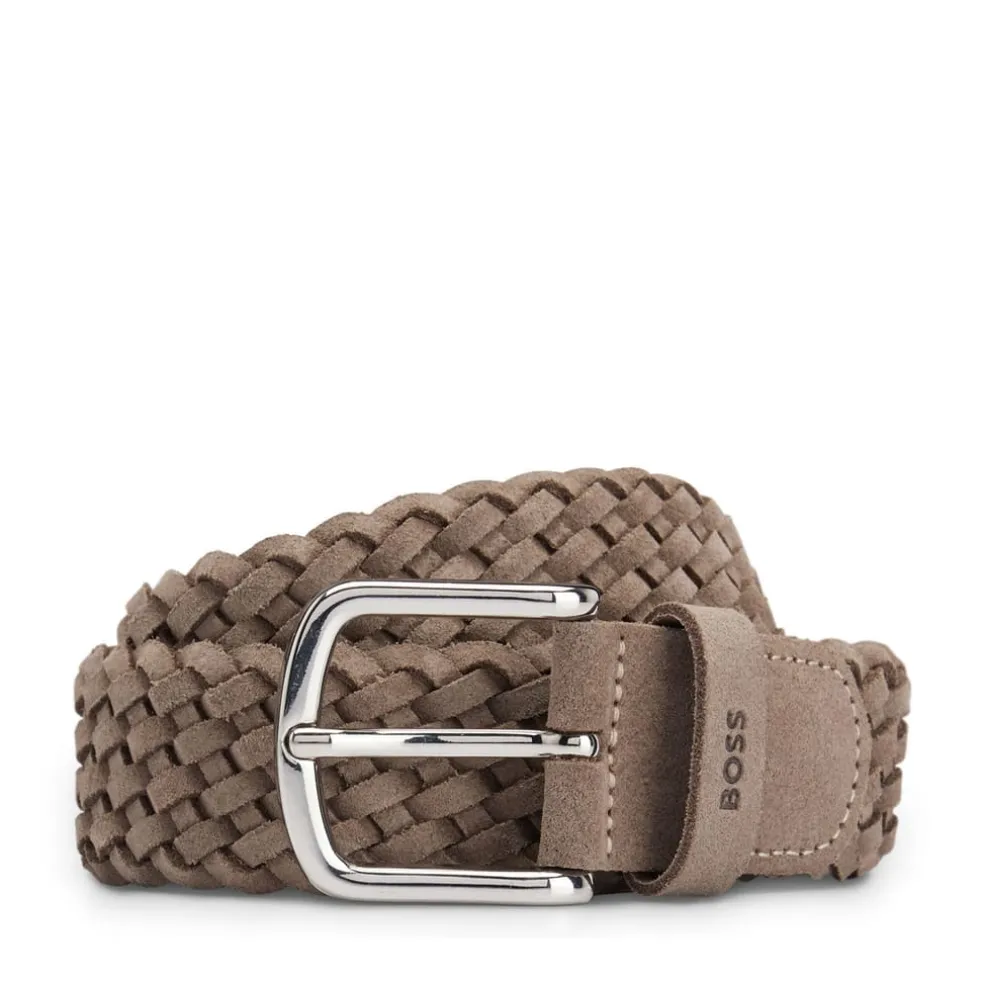 Signature BOSS belt in woven suede, featuring a polished pin buckle and a logo-debossed keeper.