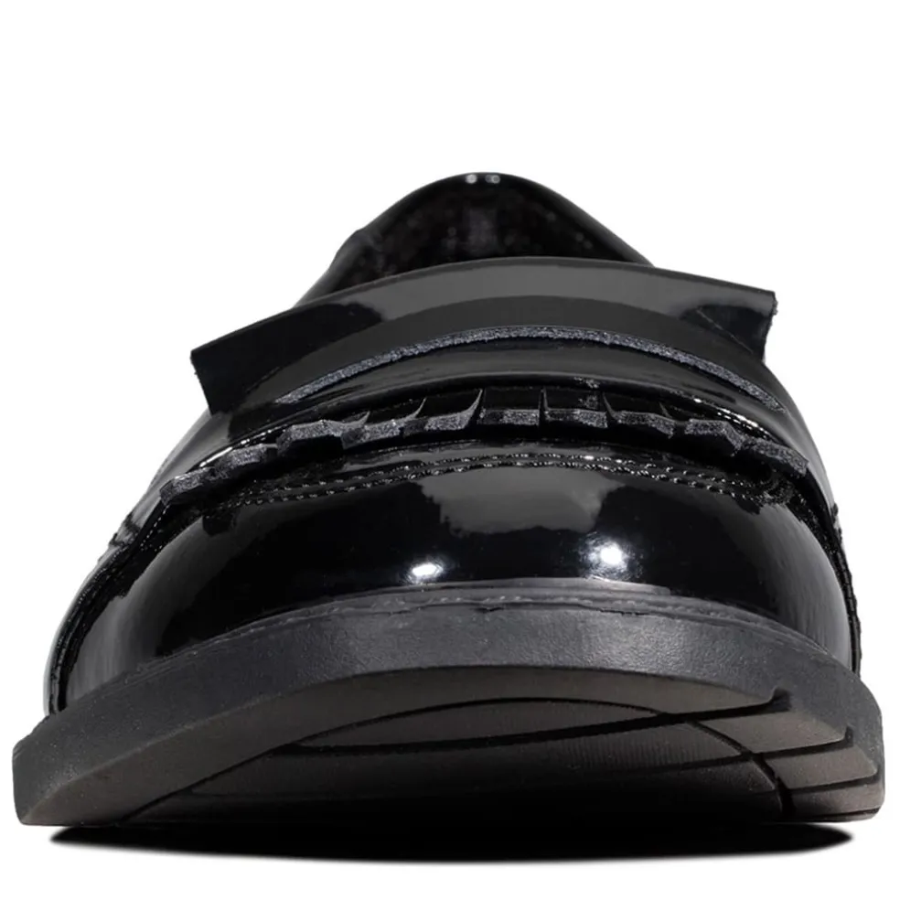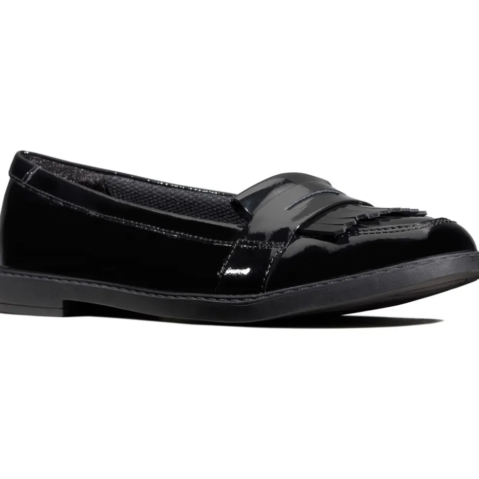 The Kids Clarks Scala Bright Loafers are perfect for heading back to the school, featuring a slip on design with a cushioned insole and a moulded rubber outsole that ensures all day comfort. A patent finish along with tassel detail to the forefoot gives a smart and stylish look, finished off with the Clarks branding.