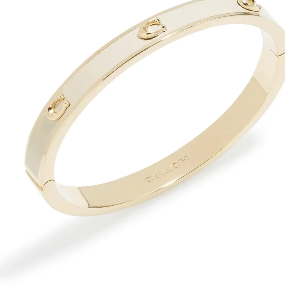 Neutral chalk enamel hinged bangle bracelet adorned with signature sculpted C motifs perfect for everyday. Bracelet has an easy hinge closure. Made from brass and enamel. Includes signature COACH jewelry pouch.