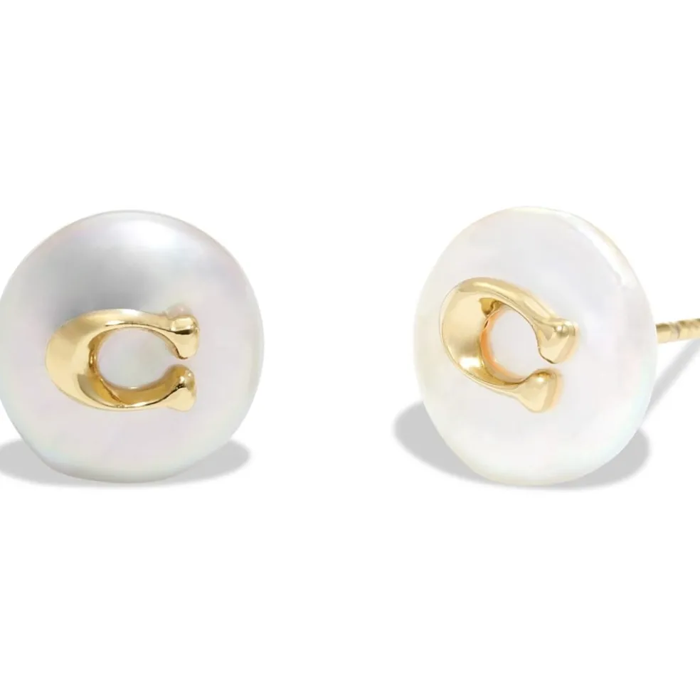 Delicate freshwater coin pearl stud earrings adorned with signature sculpted C. Earrings have a post back closure. Made from brass and freshwater pearl. Includes signature COACH jewelry pouch.