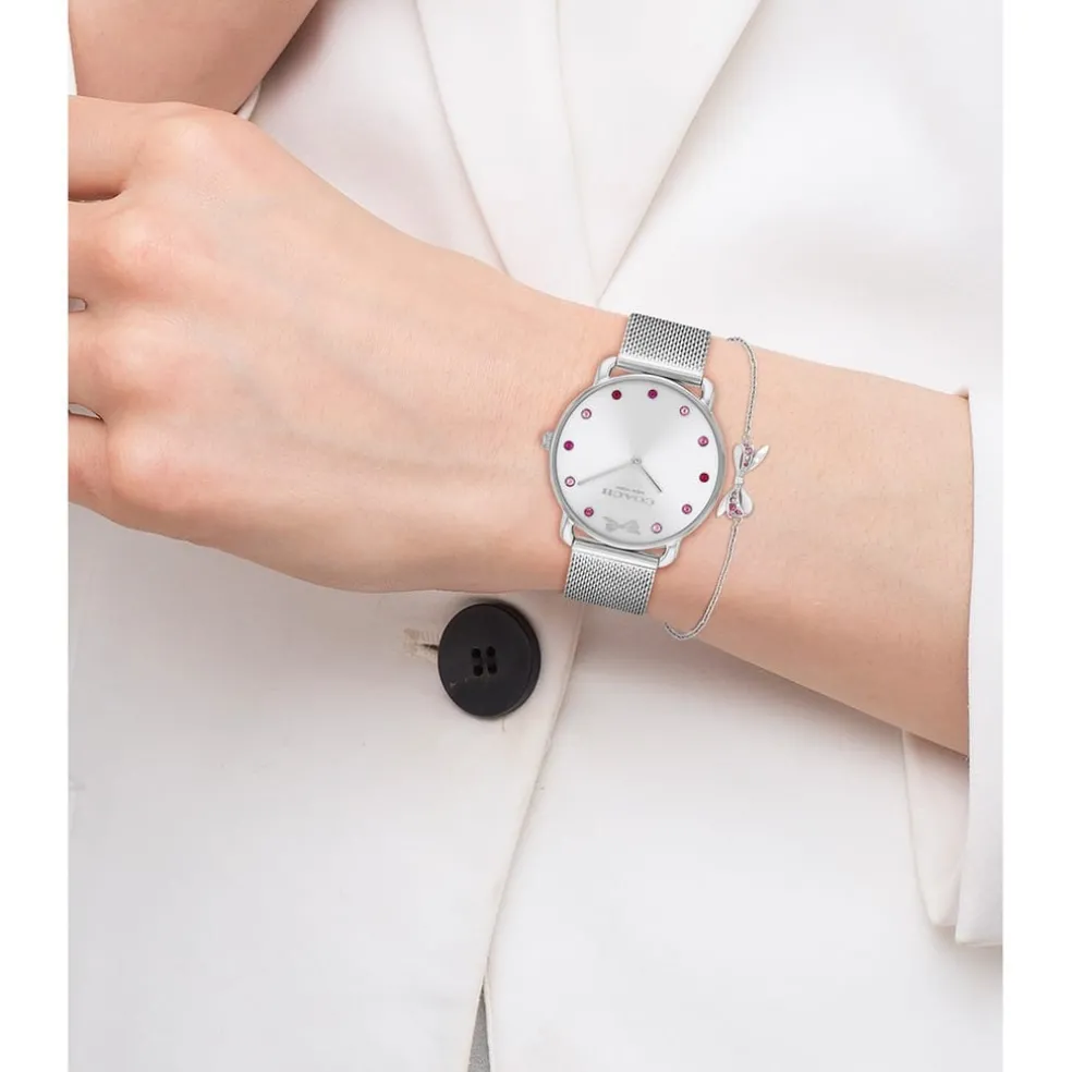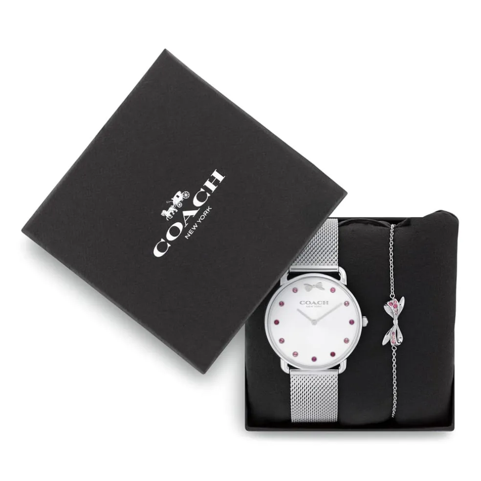 Ladies Coach watch and bracelet Elliot gift set. Featuring a 36mm stainless steel case with bow and crystal markers finished with a stainless steel mesh bracelet. Paired with a stainless steel bow detail bracelet.