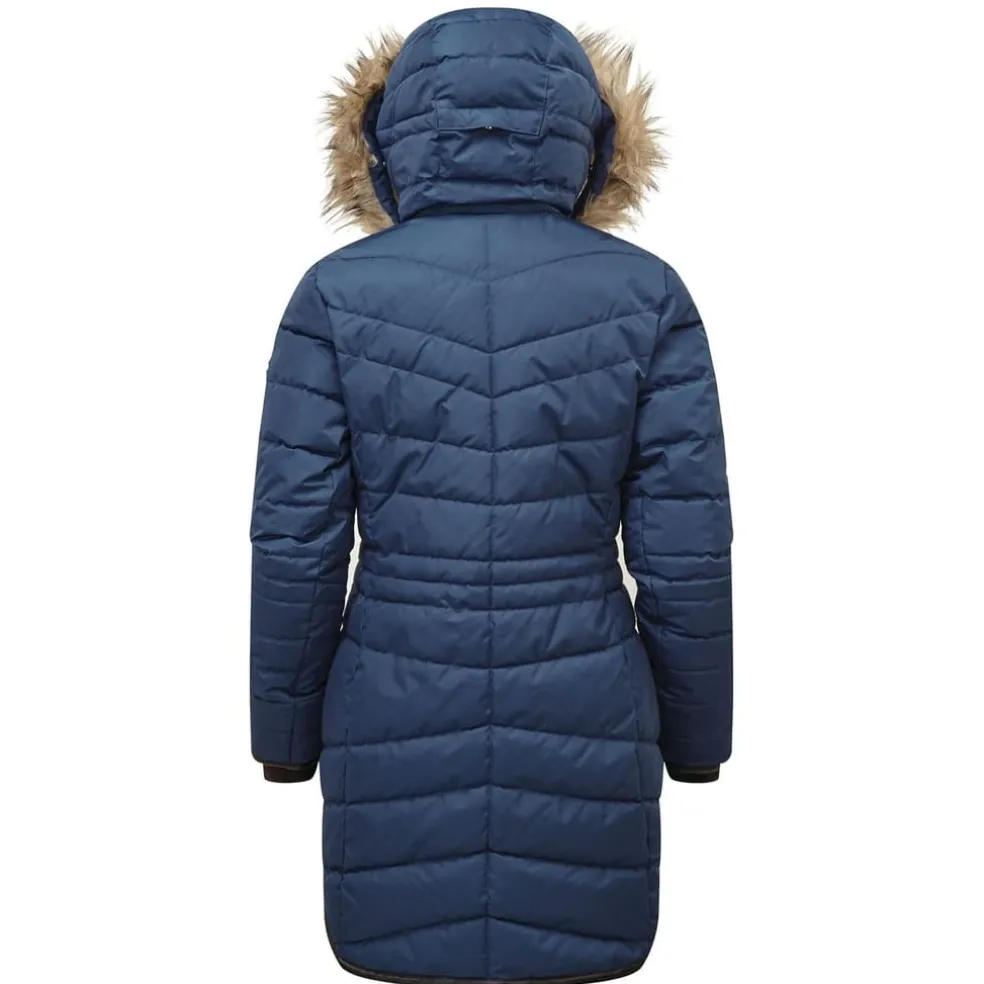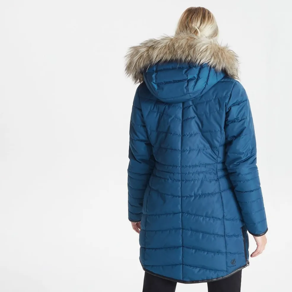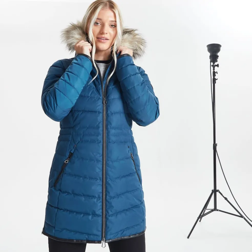 The Laura Whitmore Edit Striking II Ski Jacket. Long line and quilted, made from ARED 5 000 waterproof and breathable fabric. Soft-touch and high-shine with flattering cut lines. Snug low bulk padding to keep the heat in. Snug hood trimmed with detachable silky soft faux-fur. Lush velvet trim collar and embellished with Swarovski Crystals for a touch of luxe. Step out in style.