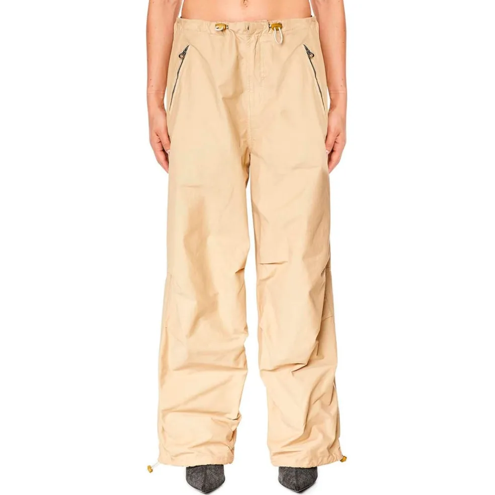 Women’s Diesel P-Diamanda Cargo Pants. The Diesel P-Diamanda are full-length cargo pants in a cotton-nylon micro twill fabric. Pleats next to the knees create an ergonomic silhouette that is easy on the body and a front fly opening with hidden metal hook and zipper ensures a clean look.- Drawstring waistband.- Concealed front fastening and fly.- Several pockets.- Zippered side and back pockets.- Low rise.- Drawstring cuffs.- Wide leg.- Loose fit. Material: 69% Cotton, 31% Polyamide. Ref: A130010KIAE72S.