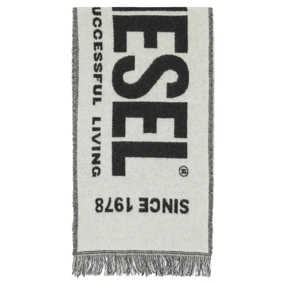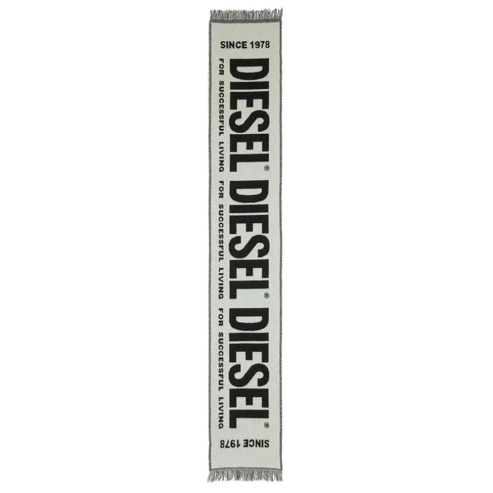 Men’s blended wool scarf with ‘Diesel For Successful Living’ jacquard design. Edged with fringe trims.