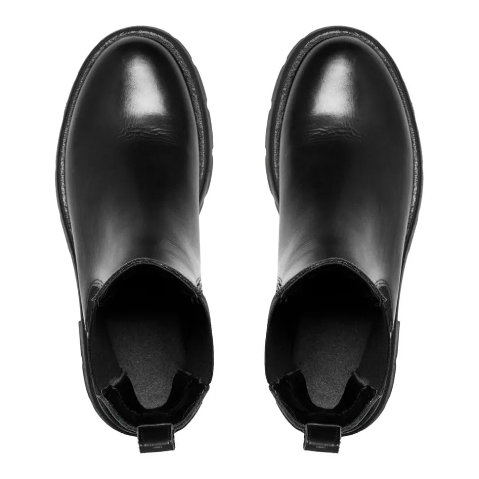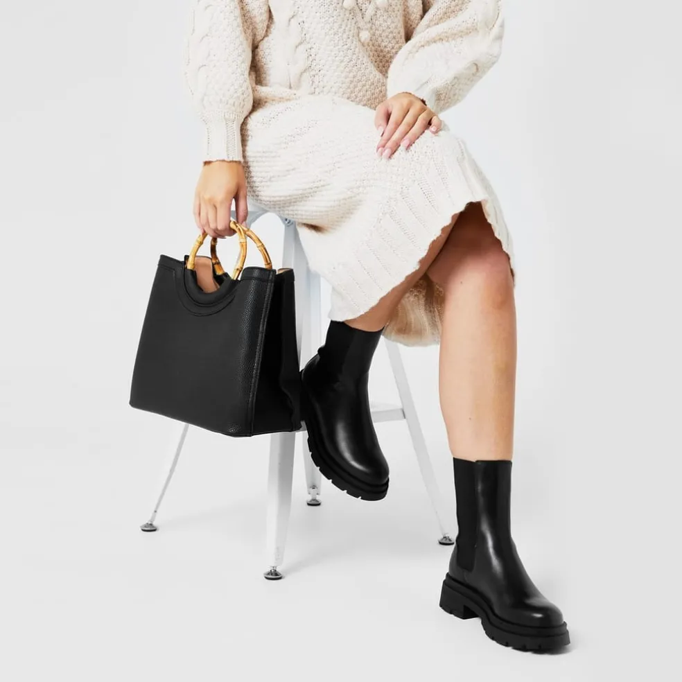 In a modern calf-high silhouette, these leather boots detail a solid block colour to the outer silhouette with elasticated panels to the side for a comfortable fit. With a chelsea boot style, these everyday staples are sat upon a durable synthetic sole with a pull tab to the upper for an easy fit. Pair with a knitted dress and tights for a transitional look that will see you through the colder months.