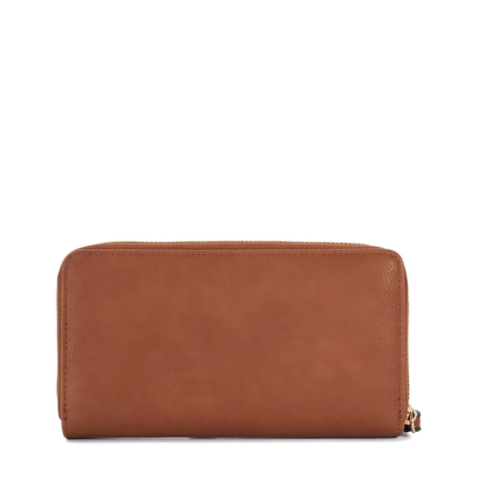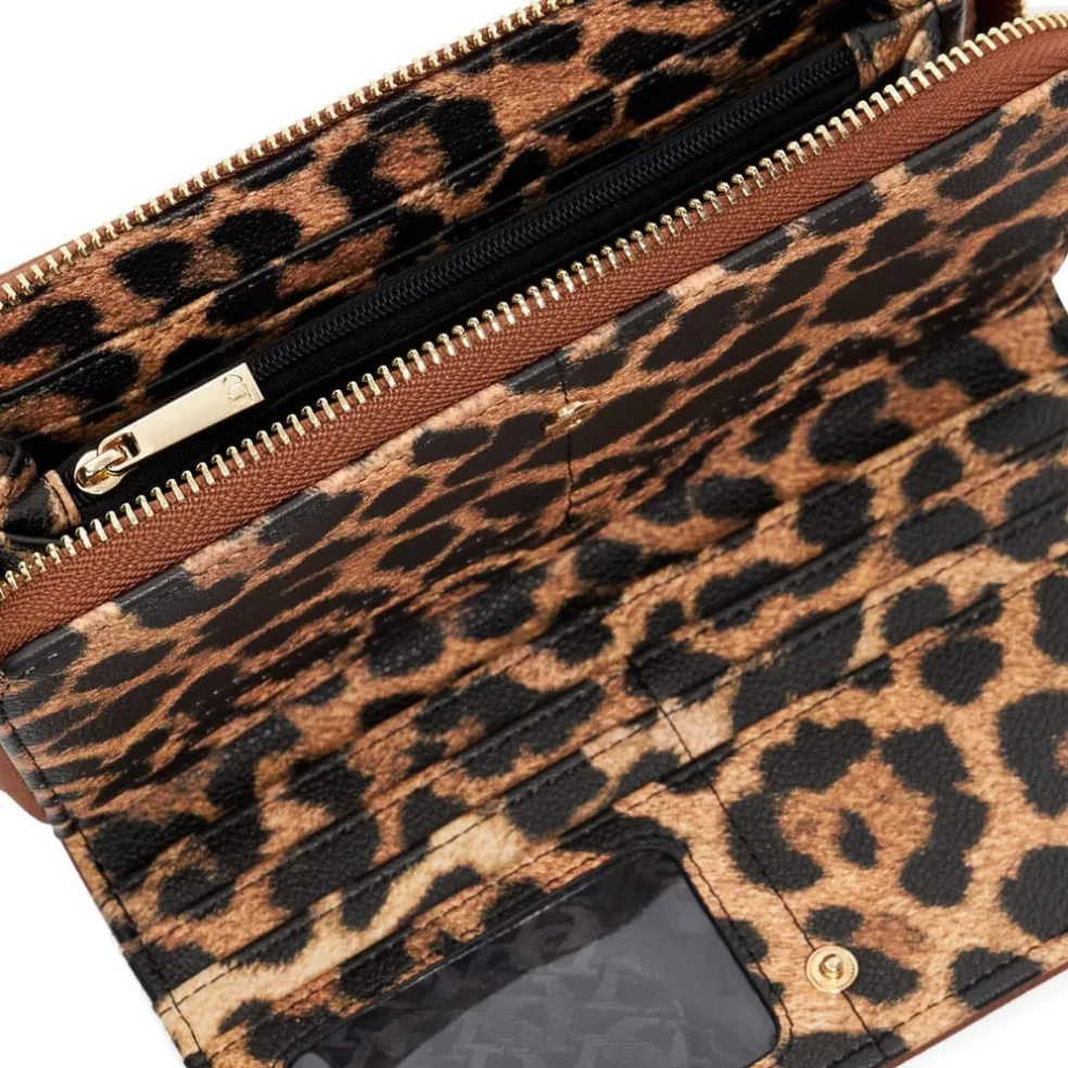 This stylish purse has been crafted in tan and features a leopard print lining. This sleek and compact design opens up to reveal a zip compartment to keep your essentials safe and a section to store your cards. Complete with our logo on the front in gold hardware the additional wristlet detail allows you to carry Krissyo hands free.