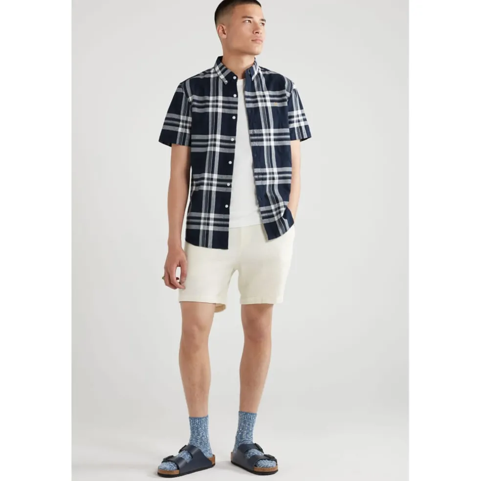 Button-down collar.Short sleeves.Embroidered branding.Check pattern design.Curved hem.