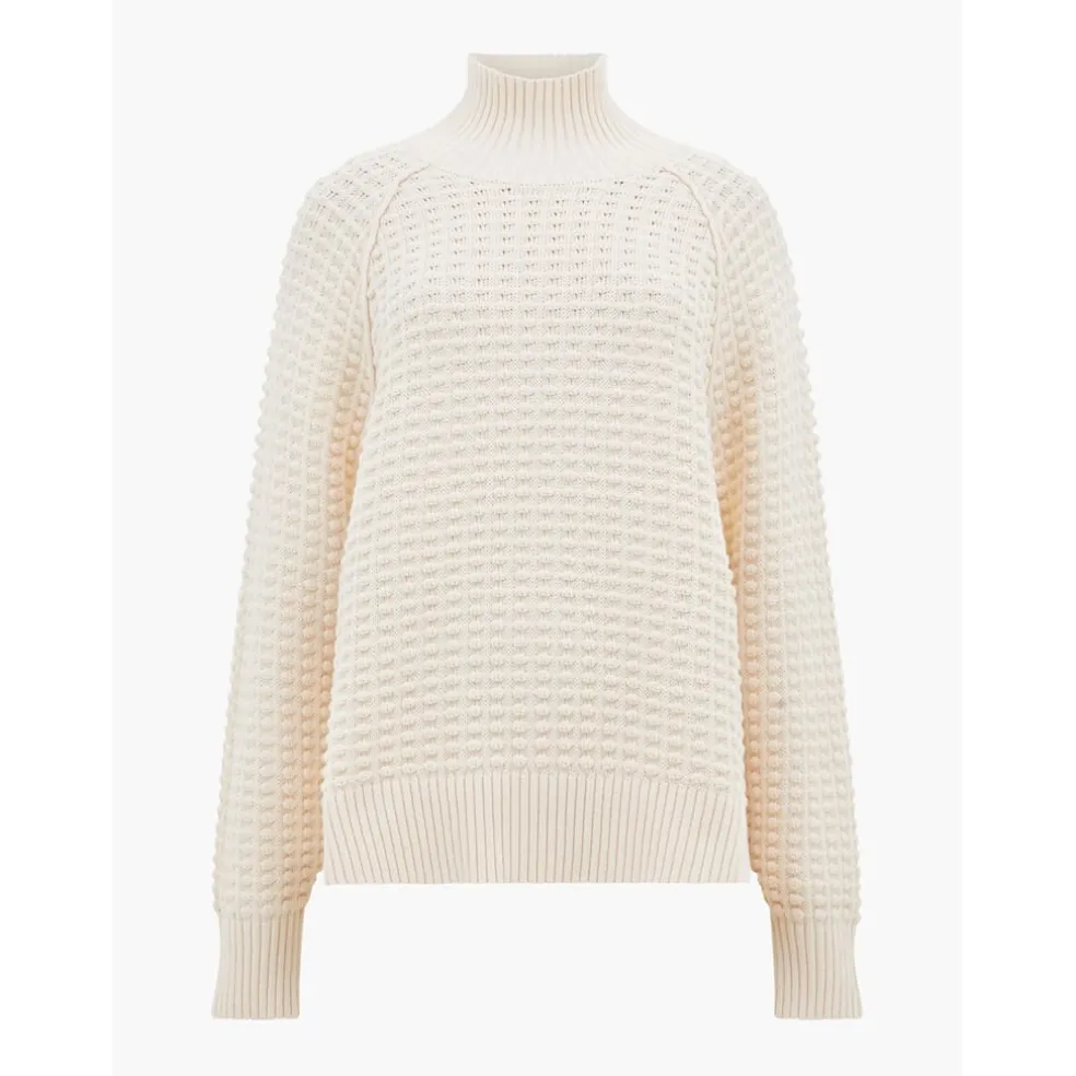 The French Connection sweater is a stylish addition to your wardrobe. Featuring a high collar and raglan long sleeves with a ribbed cuff, this relaxed fit piece is crafted with a unique waffle pattern. Ideal for those who appreciate comfort and design in their tops.