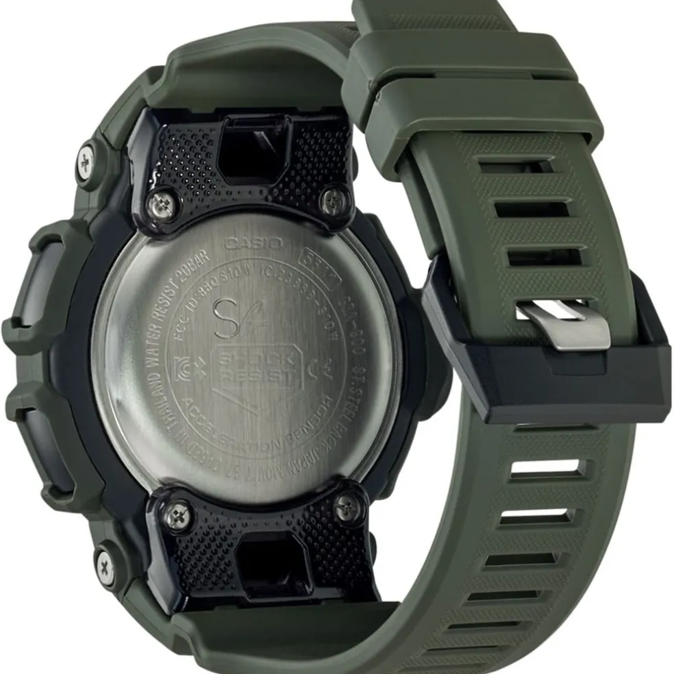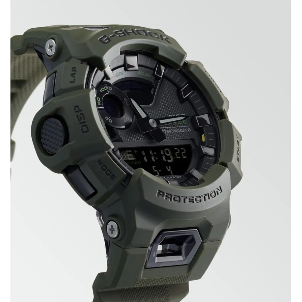GBA-900UU, the new Urban Utility colours from G-SHOCK G-SQUAD GBA-900 series. These models can measure distance using an accelerometer while linked with the GPS function of a smartphone via Bluetooth®, and once you have taken measurements with a smartphone, the next time you will be able to measure distance with the watch alone. You can also check your activity history by linking with an app running on your smartphone. The app also helps to simplify the configuration of watch settings and training management. A Super Illuminator keeps face information easy to read, even in the dark, and the band’s soft urethane material improves the fit to the wrist, and vent holes improve breathability. This watch connects with your phone via Bluetooth® to support auto time adjustment, phone notifications, step tracking, and other functions throughout the day. Battery life is approximately two years between replacements.