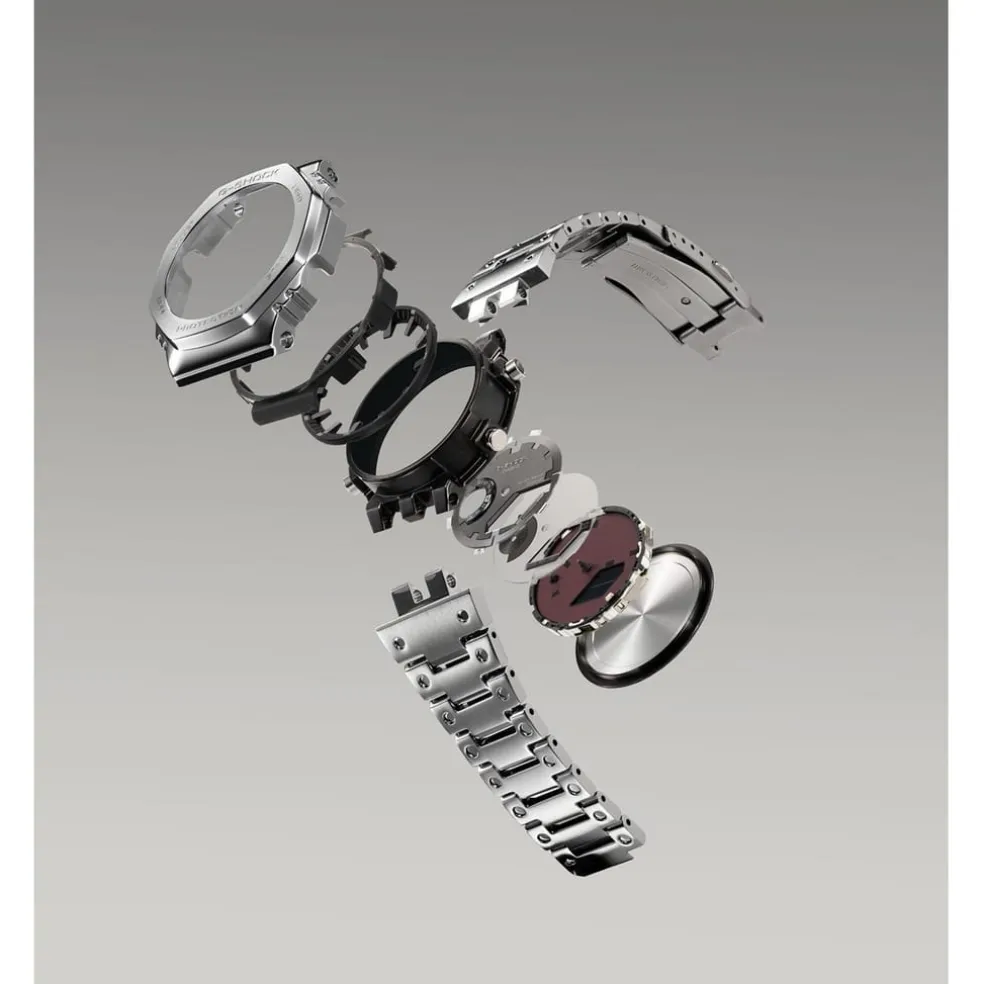 – The full-metal construction with a screw-back case, bezel, and band crafted in stainless steel creates a streamlined, minimalist design, while protecting the module from impact when dropped. We take it way back with the octagonal bezel and dimpled band design of the original from 1983, all done in metal.