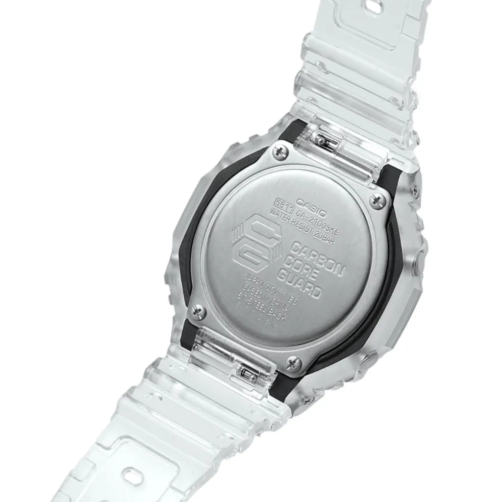 The GA-2100SKE is part of the all new white Skeleton Collection, featuring futuristic transparent bands and bezels. Based on the future classic 2100 octagonal shape, it features G-SHOCK benchmarks of shock resisitancy, 200M water resistancy and tough mineral glass. Packed with functions and stylish details.
