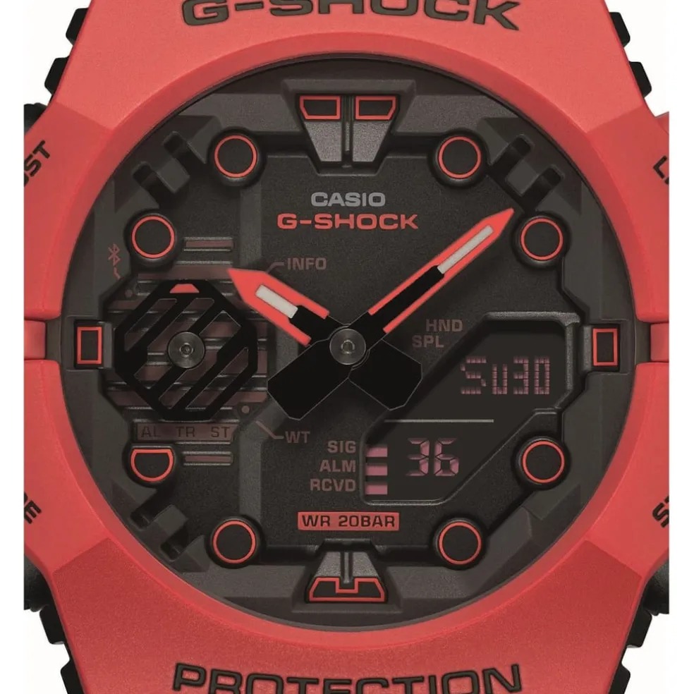 Introducing the new GA-B001 series from G-SHOCK -Featuring a new toughness-driven design and Smartphone Link functionality. With the GA-B001 and GA-B001G, Casio brings ingenuity to the exterior structure to achieve an integrated bezel and band construction in a shock-resistant watch which comprises two separate components that connect at the 9 and 3 o’clock positions.The molded construction follows the lines of the wrist, minimizing the space between the wrist and watch for an enhanced fit. These watches are all equipped with a Mobile Link feature for pairing with a smartphone via Bluetooth®. When used with the dedicated CASIO WATCHES app, the watch automatically adjusts to the correct time. In addition, the App information function sends notifications on the watch when the app receives updates on new products and other information. The GA-B001-4AER features a new shade of red, making it feel altogether different.