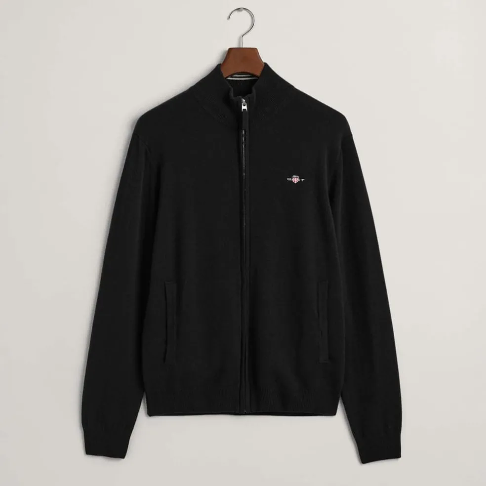Crafted from 100% superfine lambswool, this GANT cardigan is a great addition to any wardrobe. Designed for a regular fit, it features front zip closure, side pockets, ribbed detailing at the neck, hem and cuffs and a small-scale shield graphic embroidered on the chest.