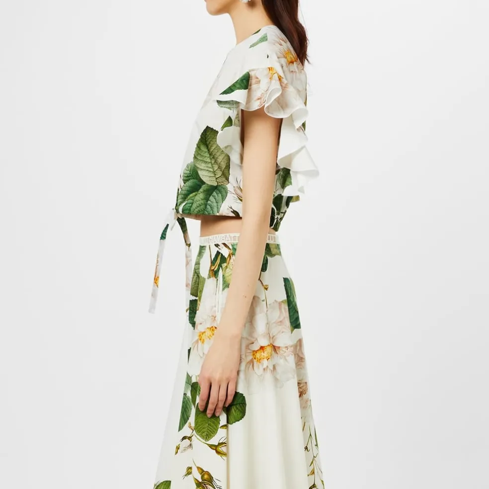 This Giambattista Valli midi dress showcases an elegant A-line silhouette, perfect for any occasion. The dress features a crew neck and short ruffle sleeves, adding a touch of sophistication. Adorned with a beautiful floral pattern, it embodies a timeless charm. The ruffle embellishments further enhance its graceful appeal, making it a standout piece in any wardrobe.