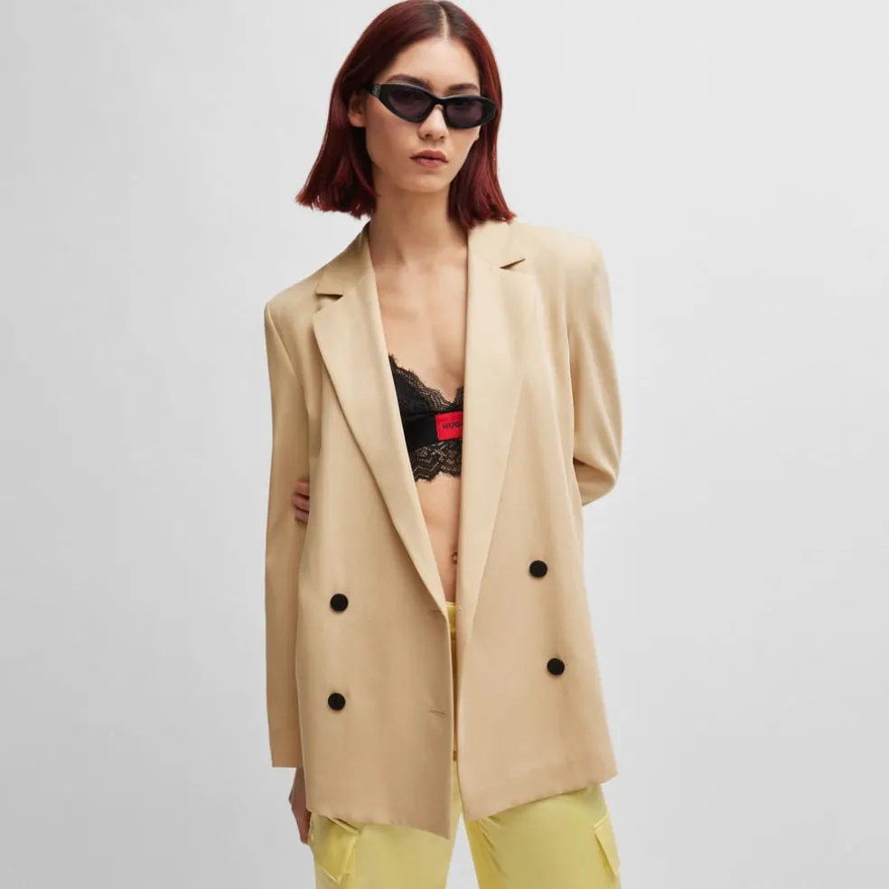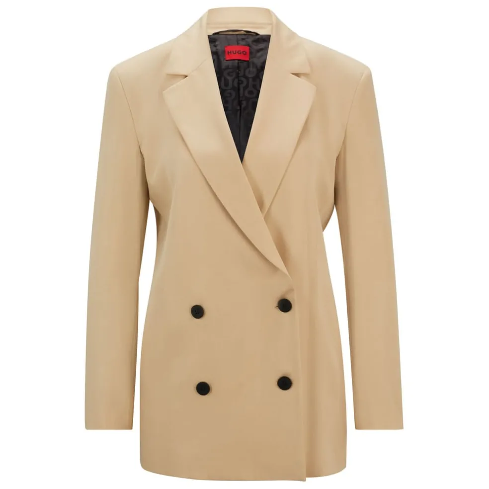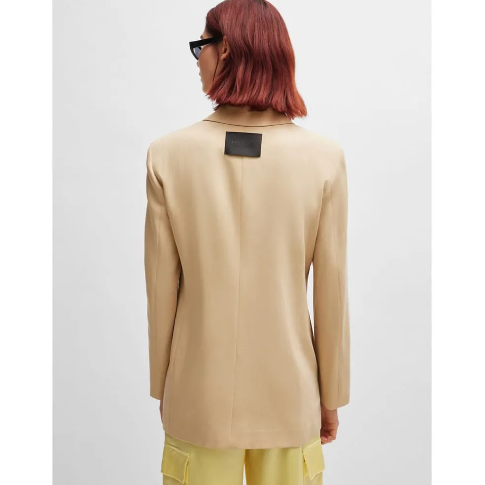 A regular-fit jacket in a long length by HUGO Womenswear, crafted in soft fabric with signature lining and a double-breasted closure.