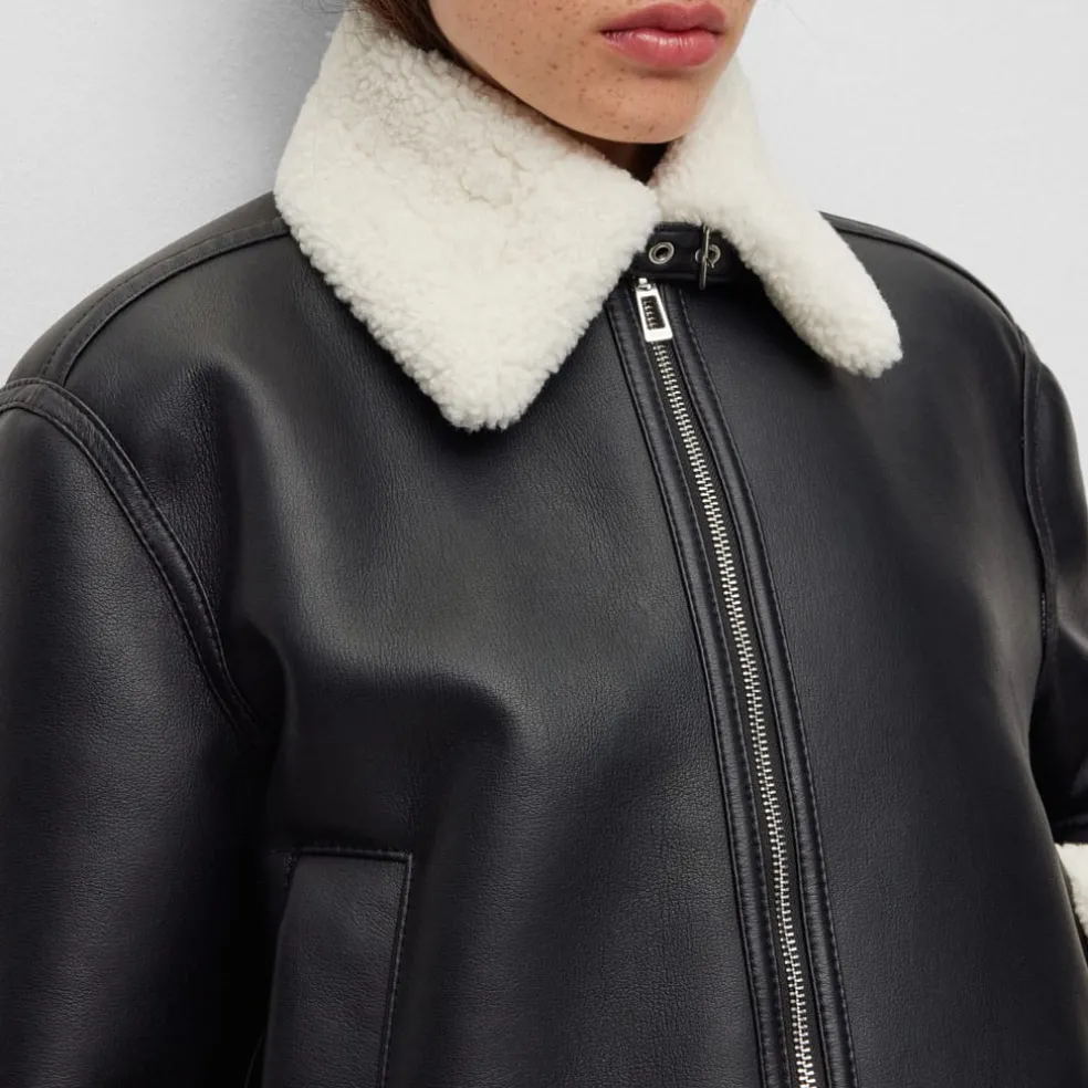 cropped middle zip jacket / big collar with buckle closure detail / straight fit / faux leather with faux fur trim / 100% polyester
