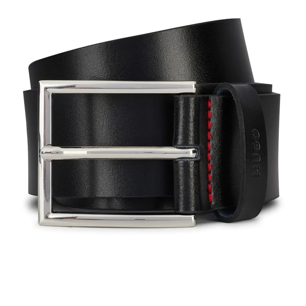 Finish your everyday style with this Giaspo Belt from Boss. Crafted from smooth and shiny leather, this style then further features a metal buckle and red contrast stitching. Perfect for completing your going out ensemble.