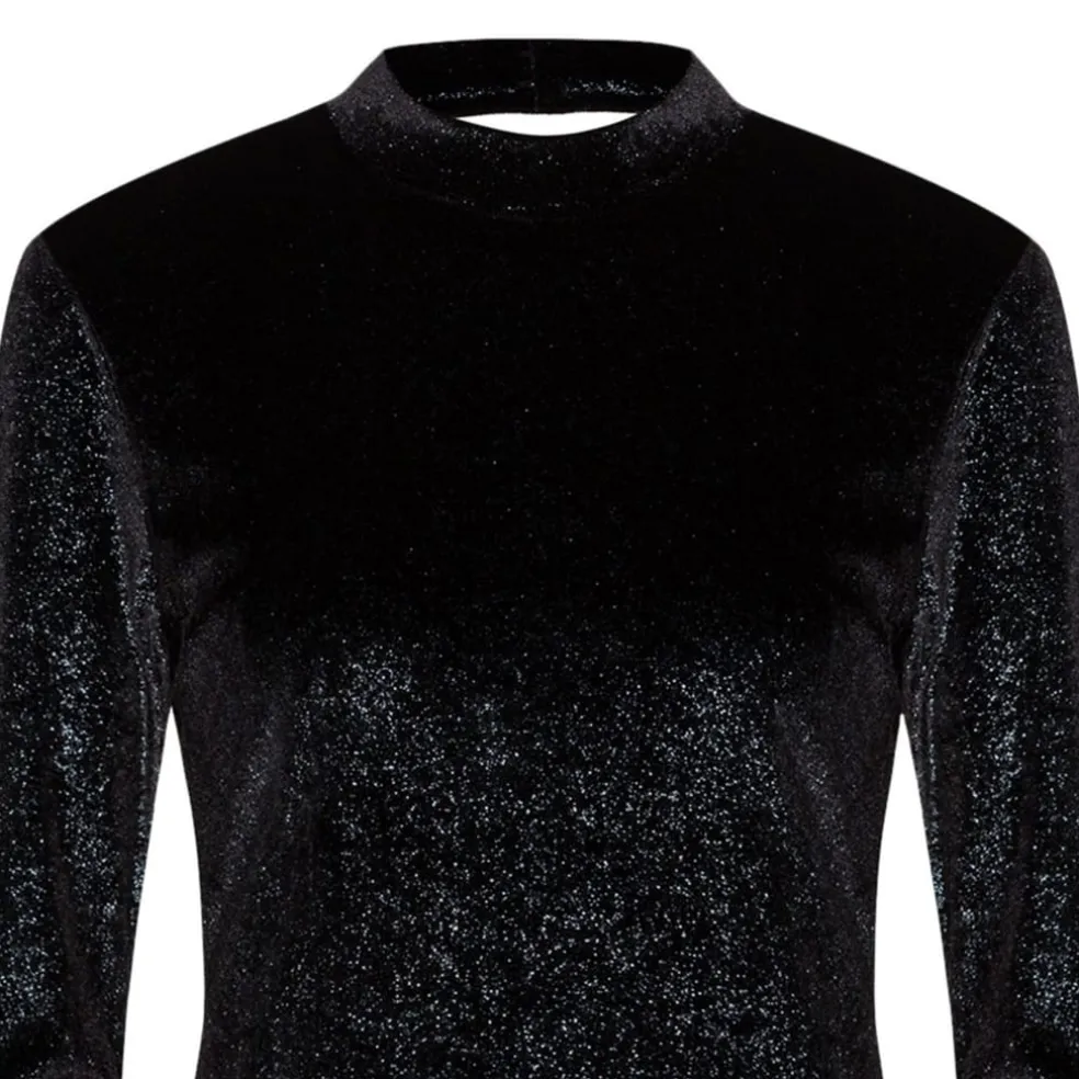 short long sleeved party dress / back cut out / button detail on neck / soft velvet black fabric with decent blue silver glitter effect
