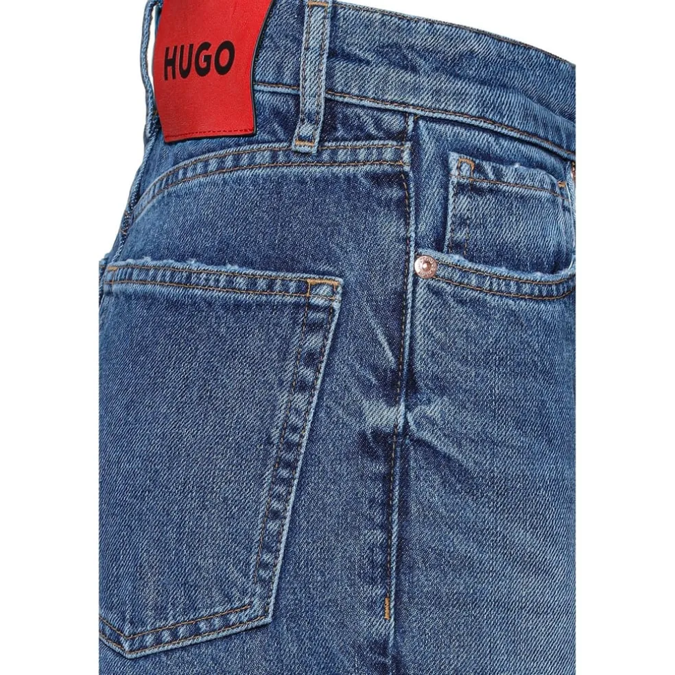 Hugo jeans with a regular fit, featuring a classic button closure. The design includes five pockets and a distinct logo embellishment, offering a blend of style and practicality.