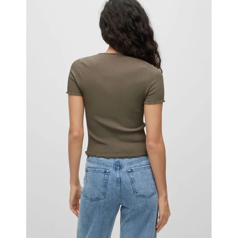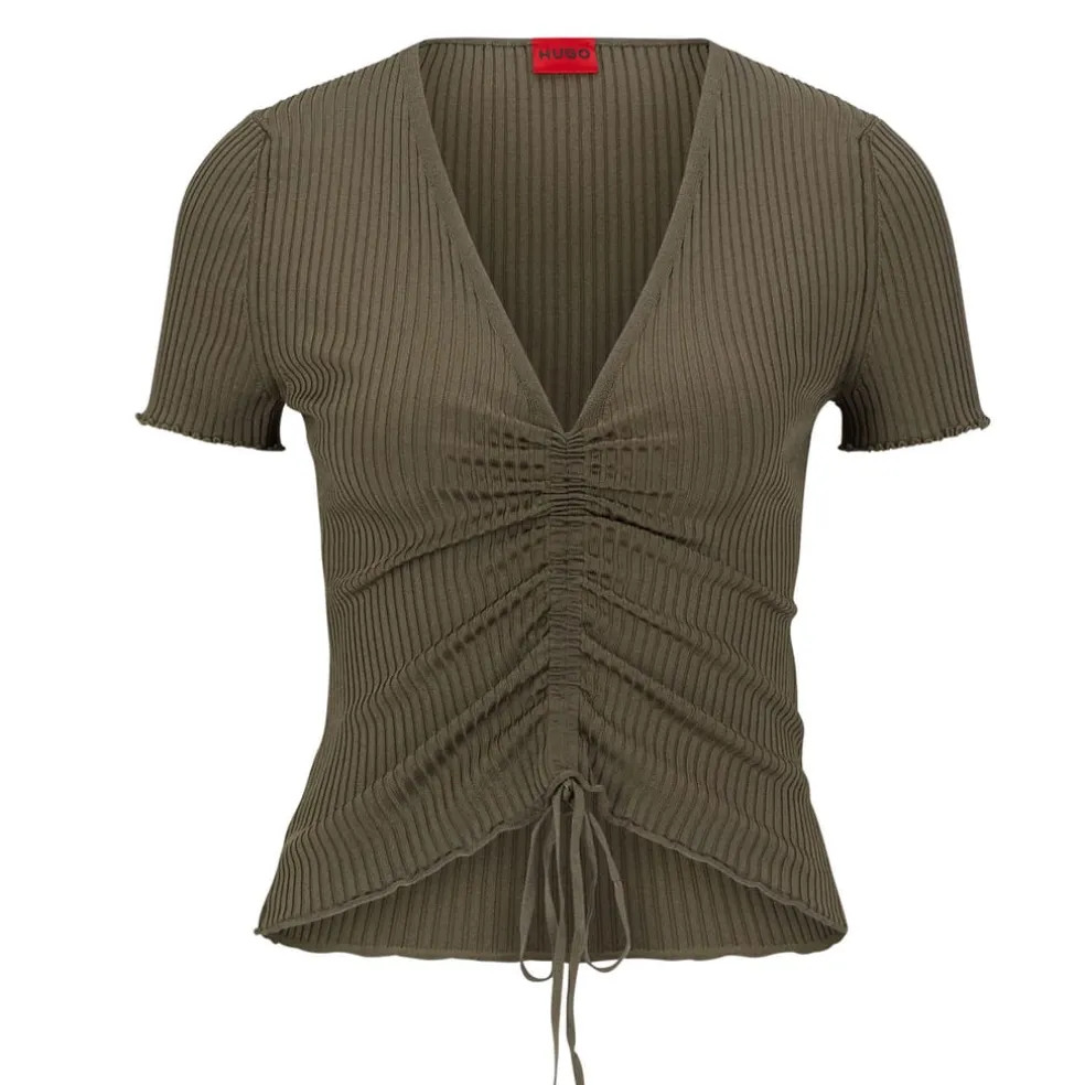 A slim-fitting V-neck sweater with short sleeves, a ribbed structure and feminine gathering through the front by HUGO Womenswear.