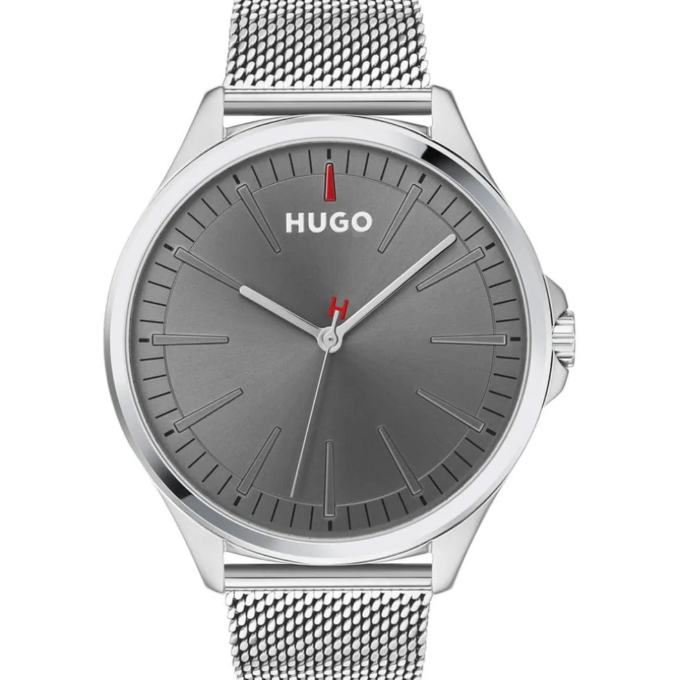 – A 43mm stainless steel case, grey dial and stainless steel mesh bracelet. Water resistant to 5ATM.