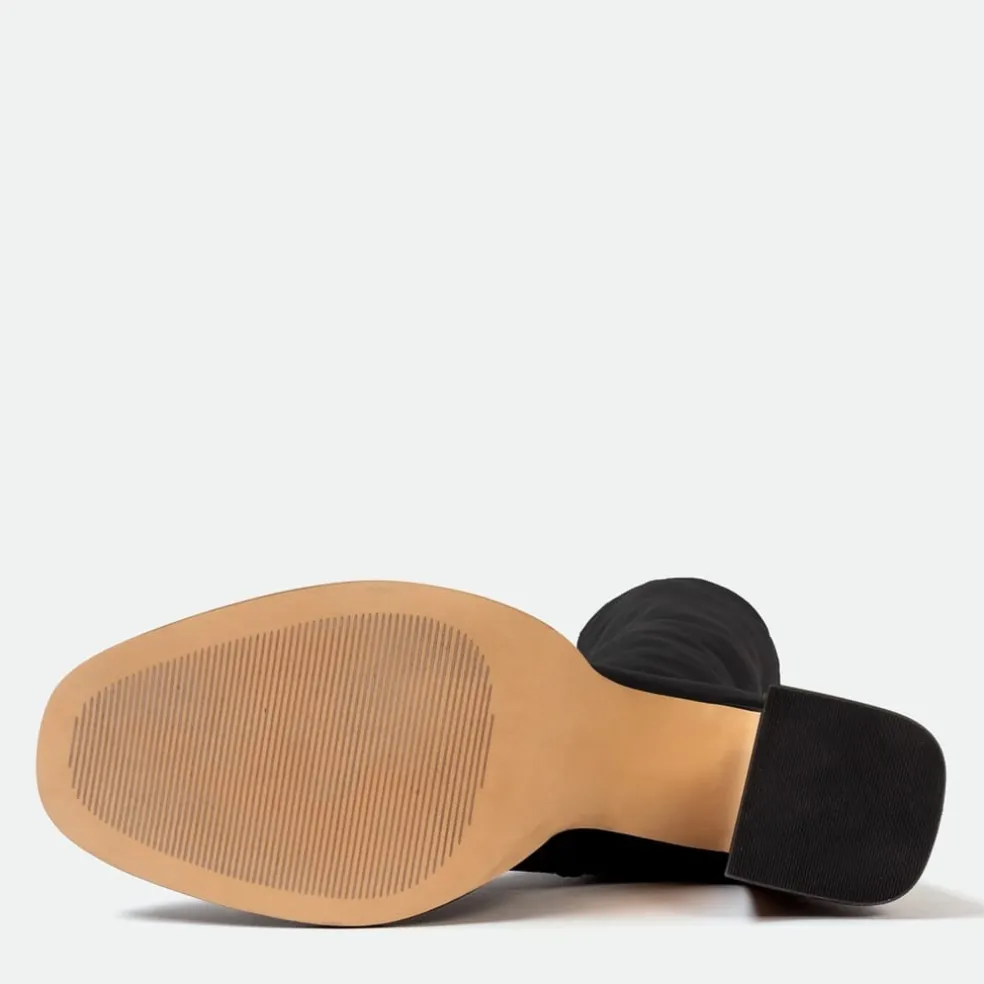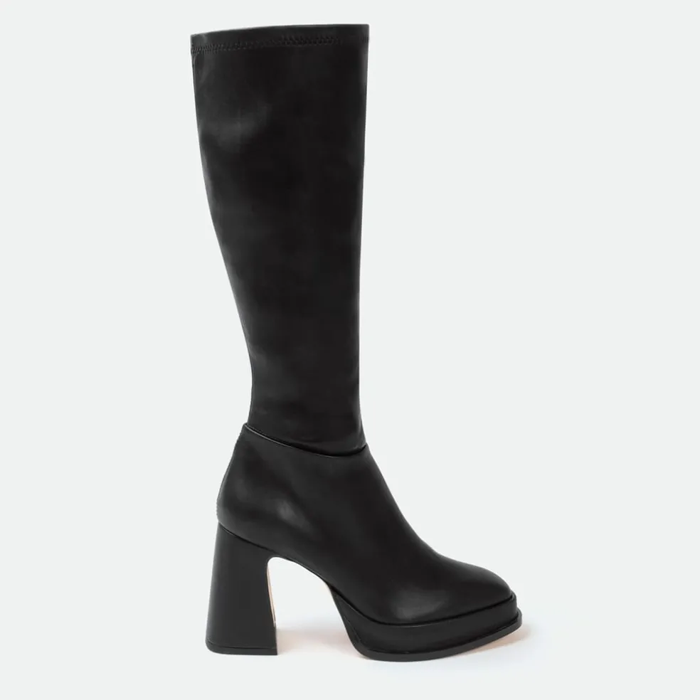 – Resting on a high stacked block heel. Stand tall (and stay comfy) with these daring platform knee-high boots serving major main character energy.