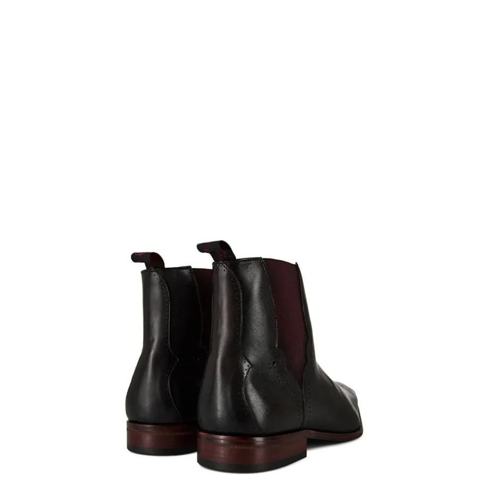 – Crafted from polished black leather, these boots feature an ankle-length design with elastic panelling and a convenient pull tab. The pointed toe displays intricate toe punch and side punch details, highlighting the exquisite quality of these boots. With a low heel, these boots offer a sleek and comfortable option for formal occasions.