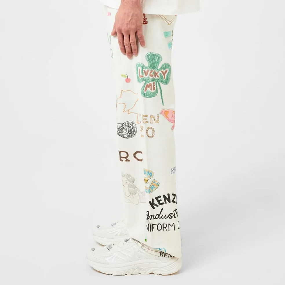 Kenzo pants feature a graphic print and a distinctive logo embellishment. Designed with a zip fly and button closure, these pants offer a stylish and functional choice for any wardrobe.
